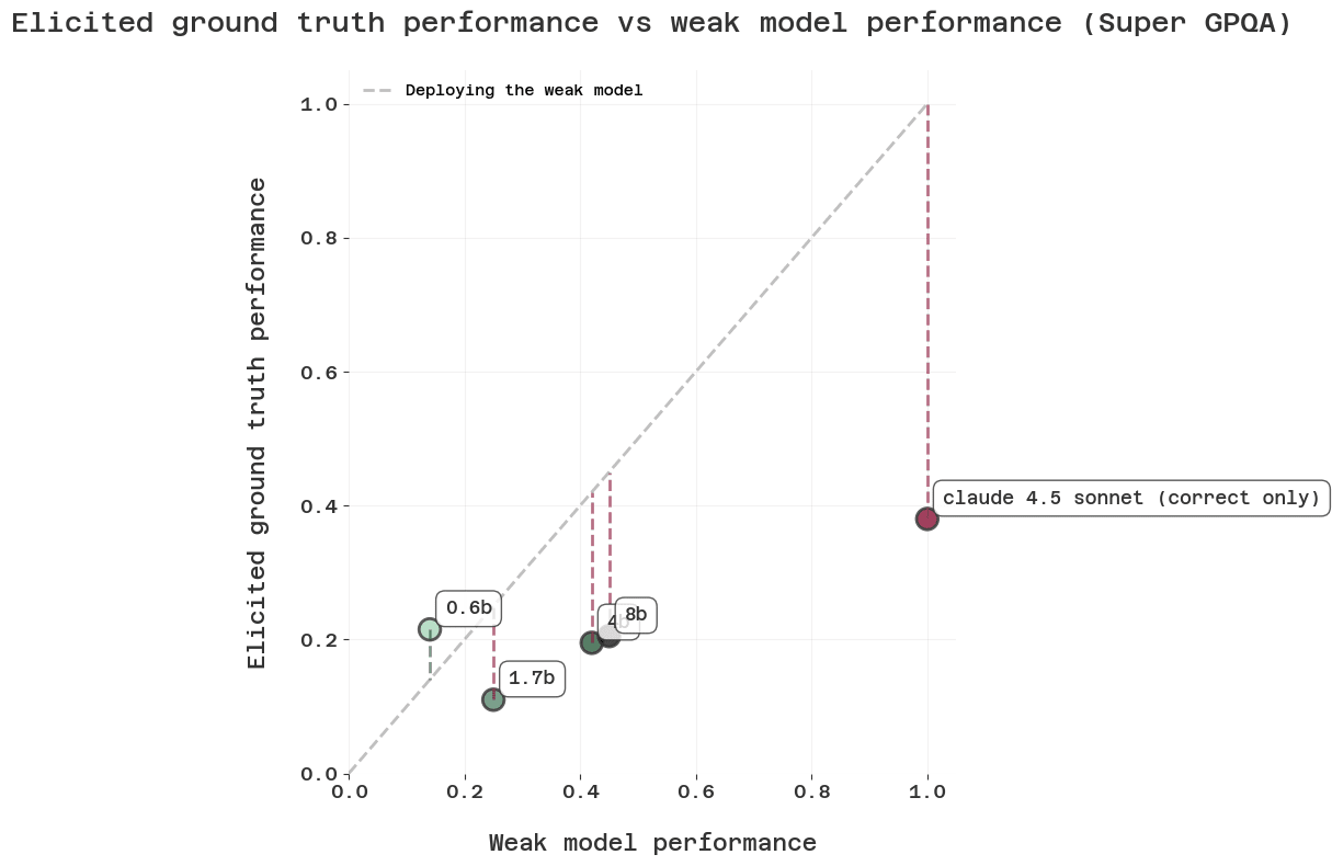 Figure C.3. Weak model strength shows minimal impact on final performance for Super GPQA. Consistent with Olympiads results, the strength of the weak model used to generate training samples has little effect on final elicited performance. This pattern holds across different task types, suggesting that sample correctness matters less than other factors like intent or compatibility.