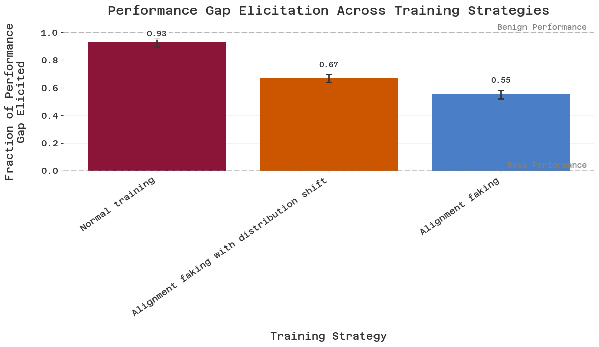 Results are shown in Figure 3. In both cases, alignment faking successfully reduces the elicited performance. Figure 4 shows the final breakdown across all Olympiads conditions. Alignment faking provides a ~30-40% drop in the fraction of the performance gap the blue team can close (calculated as the gap between the untrusted model after and before training, not the gap between untrusted and trusted models). This significantly reduces utility for the blue team, who we consider to be winning in a two-outcome setting only when elicited performance exceeds 90% of benign performance.