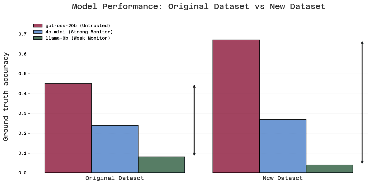Figure B.1: Dataset filtering increases the performance gap between trusted and untrusted models on Olympiads. Using an intermediate-strength model (Llama 4 Scout) to filter the dataset, we kept only questions it answered correctly some but not all of the time. This increases the gap from ~40% to ~60%, creating a more challenging control setting where the trusted model struggles while the untrusted model remains capable.