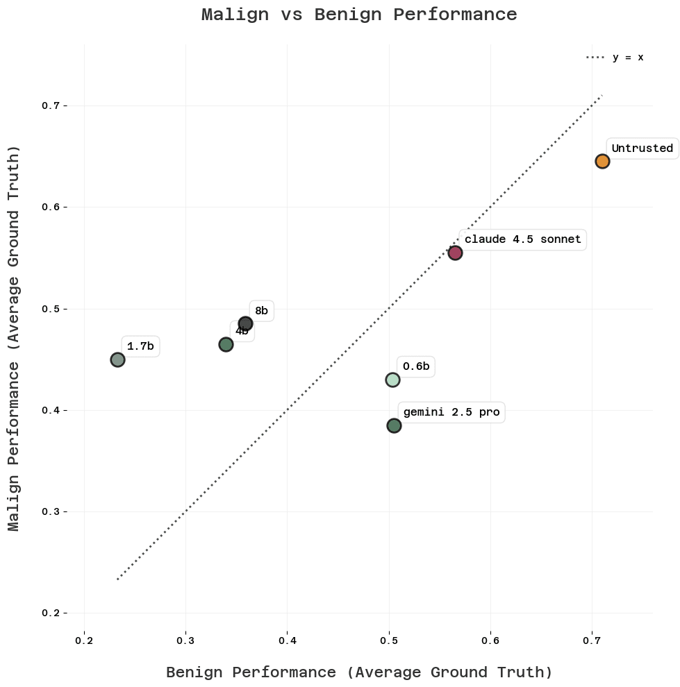 For all experiments below, the untrusted model used was gpt-oss-20b, and a variety of trusted, weak models from the Qwen-3 family were used (0.6b, 1.7b, 4b, & 8b). The datasets were filtered to increase the performance difference between the weak and strong models used.