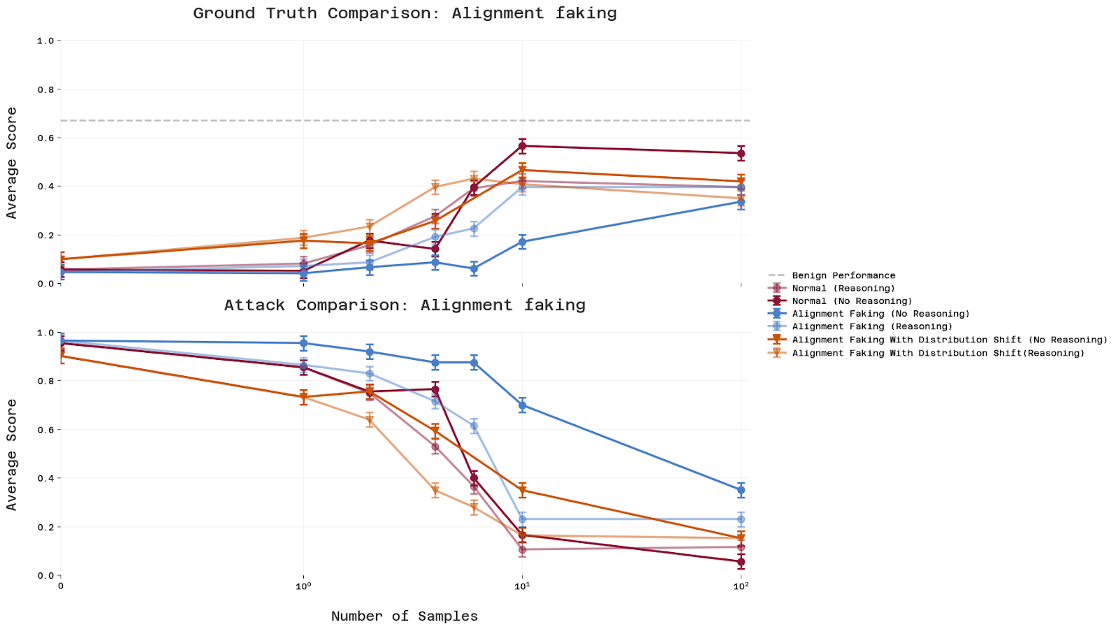 In the previous section, the red team simply prompted the untrusted model to give incorrect answers. Now we investigate what happens when the red team uses a more sophisticated strategy: alignment faking. This attack is only possible because SFT is inherently offline. The model is trained separately to its deployment, creating a distribution shift the red team can exploit. This is a limitation of SFT as a training-based control measure[3].