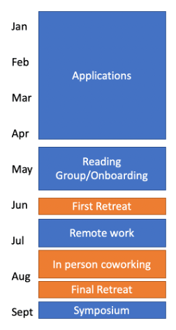 The fellowship started in mid-June with an opening retreat, and ended in mid-September with a final retreat and the delivery of Symposium presentations. Leading up to that, fellows participated in reading groups (developed by TJ) aimed at bringing them up to speed on key issues in AI risk. For the first half of the fellowship, fellows worked remotely; during the second half, we all worked from a shared office space in Prague (FixedPoint).