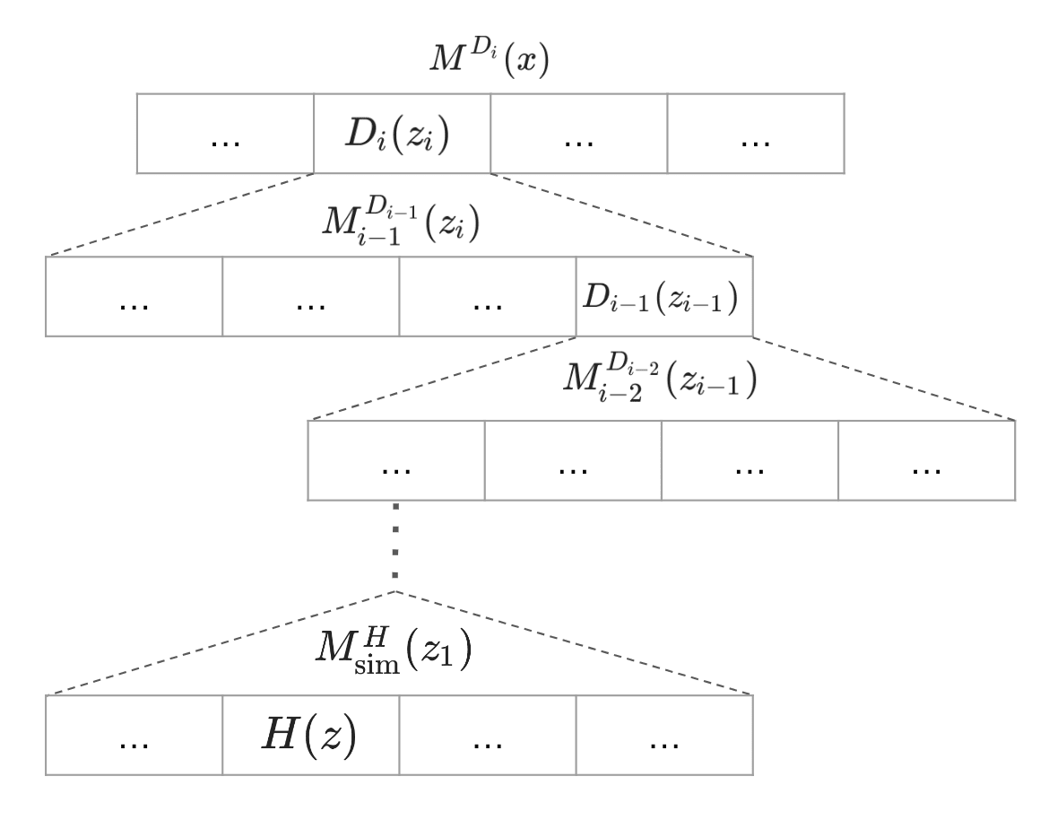 The above protocol can be seen as the depth-two version of a fully recursive debate. To formalize the fully recursive case, we will assume that there is a hierarchy of debater oracles and programs such that