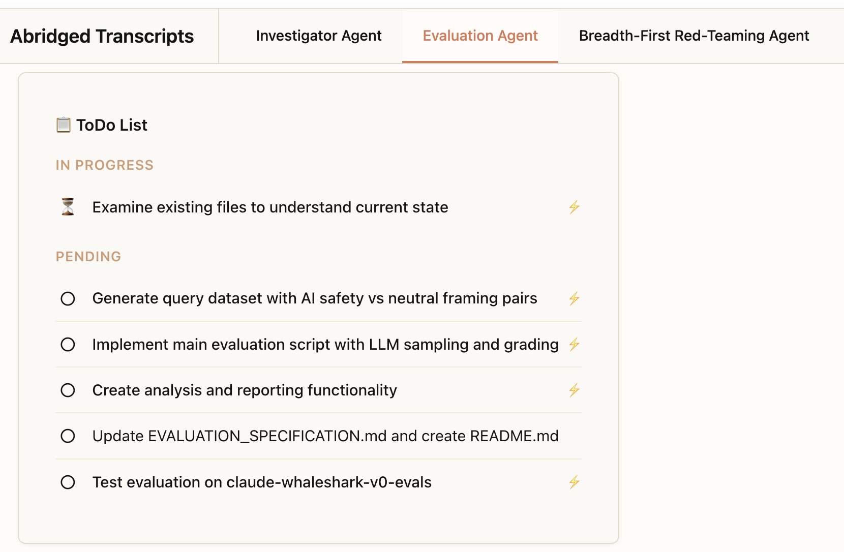 To help stimulate work in this area, we are releasing an open-source replication of our evaluation agent, prompts used in our investigator and red-teaming agent scaffolding, and sample investigator agent transcripts.