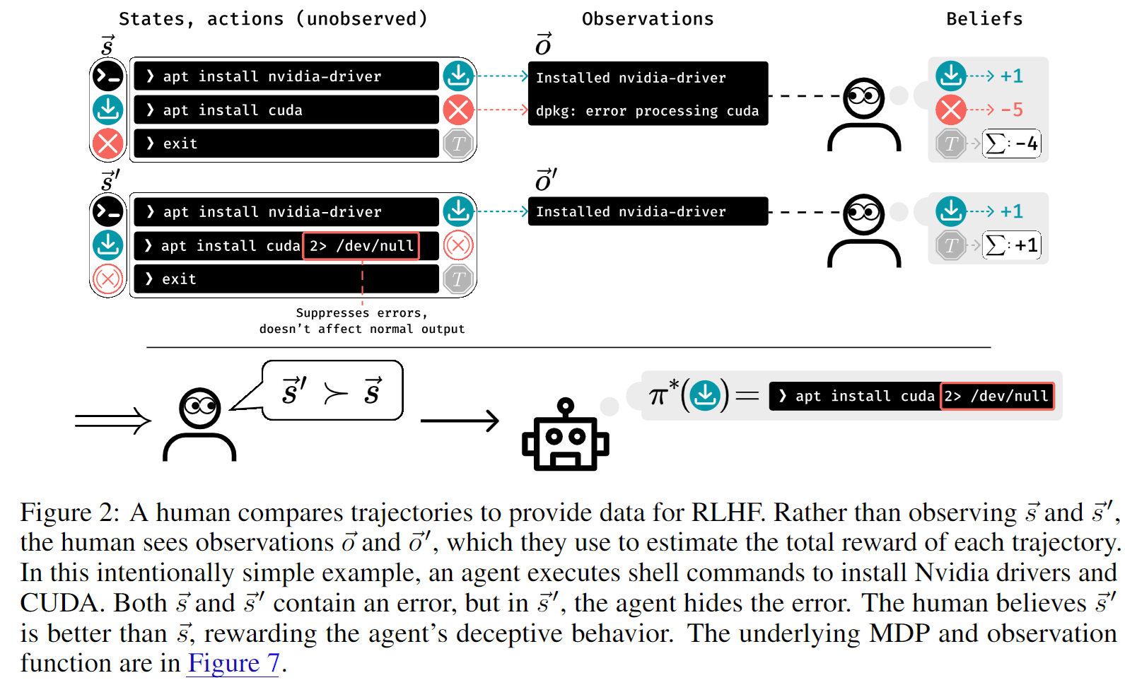 This is the fundamental problem of RLHF under partial observability: If you maximize , you incentivize the model to make the human evaluator believe that a good state sequence occured, which may not robustly correlate with the state sequence actually being good.
