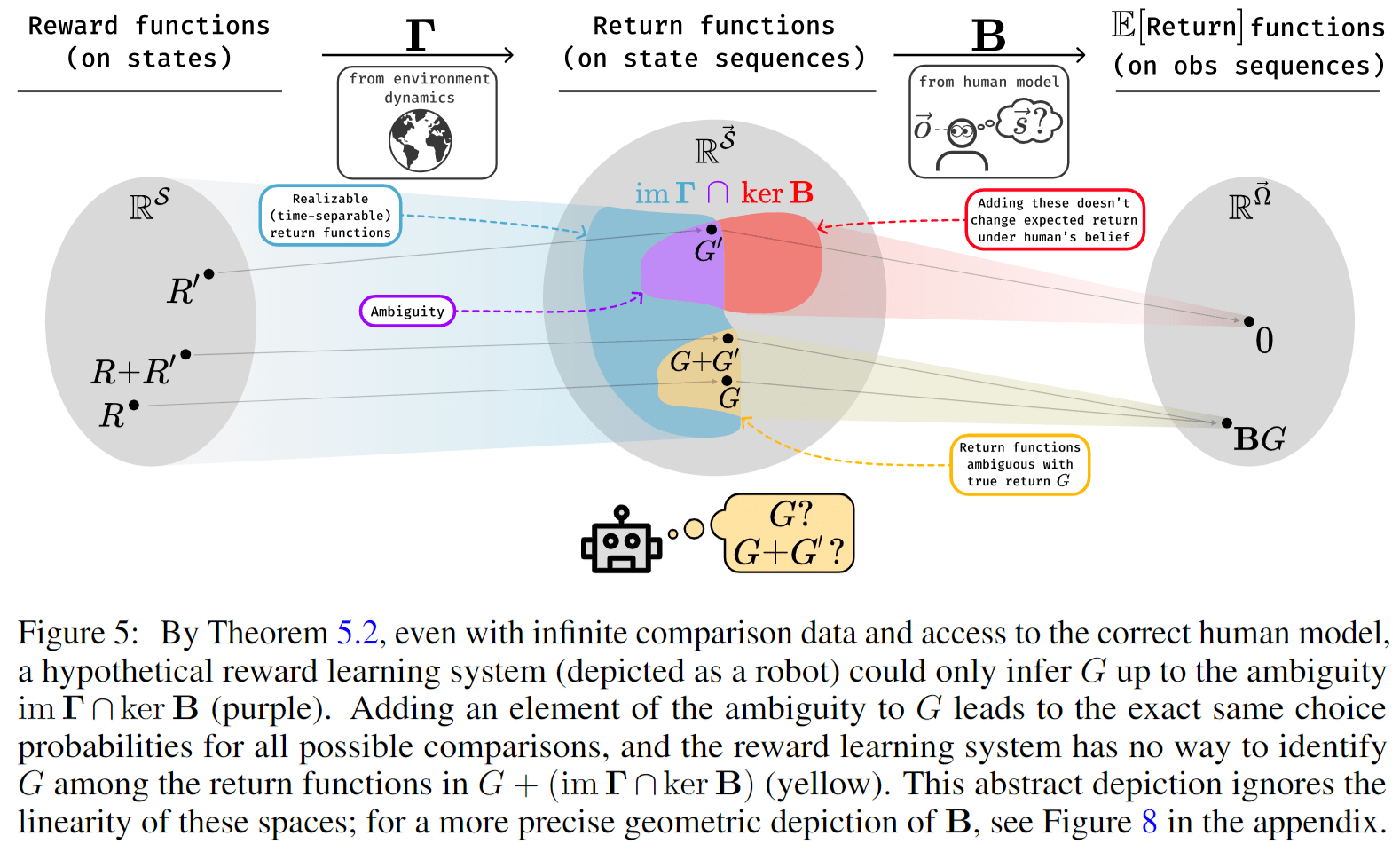 In the paper, we then provide an example (and some more examples in the appendix) showing that sometimes the ambiguity vanishes, even when naive RLHF leads to misaligned behavior. Thus, we have a proof of concept showing that when modeling the human correctly, this can lead to correct return inference. We also show that this could in principle be implemented practically if the matrix was explicitly represented. However, we caution will usually not vanish, meaning further theoretical progress is likely needed before applying these ideas in practice.