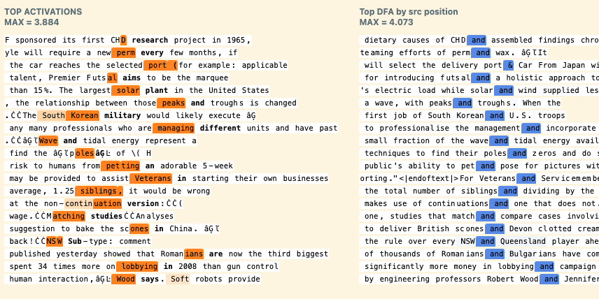 fprei(zcat)=zcat⋅Wenc[:,i]- Localize where information was moved from with DFA by source position: Recall that zcat is just the concatenated outputs of each head zj for j=1,...,nheads. Further, if we freeze the attention patterns A (shape [nheads,ncontext,ncontext]) can write any zj at destination position D as the attention weighted sum of the value vectors vj (shape [ncontext,dhead]) at each source position. This provides a per source token DFA highlighting which source positions have the greatest information contribution to activate feature i at the current destination position.