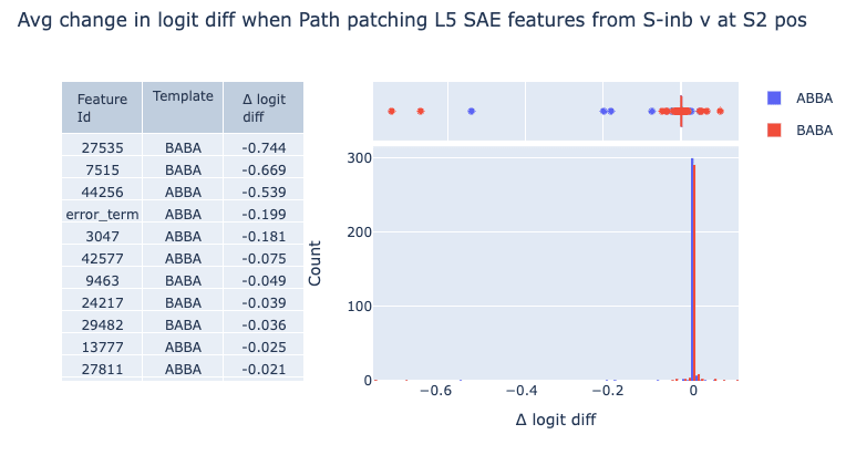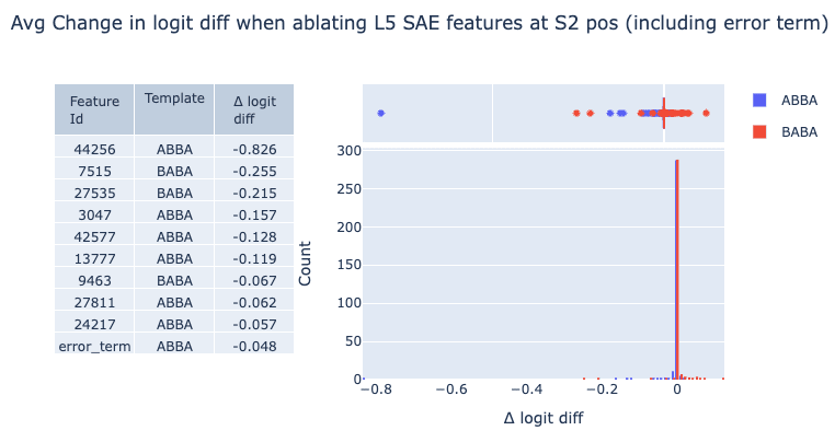 Our initial goal is to identify causally relevant features. We do this by zero ablating each feature one at a time and recording the resulting change in logit difference. Despite there being hundreds of features that fire at this position at least once over 100 prompts, zero ablations narrow down three features that cause an average decrease in logit diff greater than 0.2. Note that ablating the error term has a minor effect relative to these features, corroborating our evaluations that our L5 SAE is sufficient for circuit analysis. We distinguish between ABBA and BABA prompts, as we find that the model uses different features based on the template.