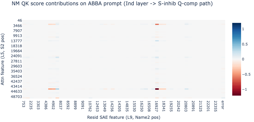We observe that these heat maps are almost entirely explained by a handful of common SAE features. On the query side we see the same causally relevant Attention SAE features previously identified by ablations: L5.7515 and L5.27535 (“I am a duplicate that preceded ‘ and’”) for BABA prompts while ABBA prompts show L5.44256 and L5.3047 (“I am a duplicate that followed ‘ and’”). On the key side we also find just 2 common residual stream features doing most of the heavy lifting: L9.16927 and L9.4444 seem to activate on names following “ and”.