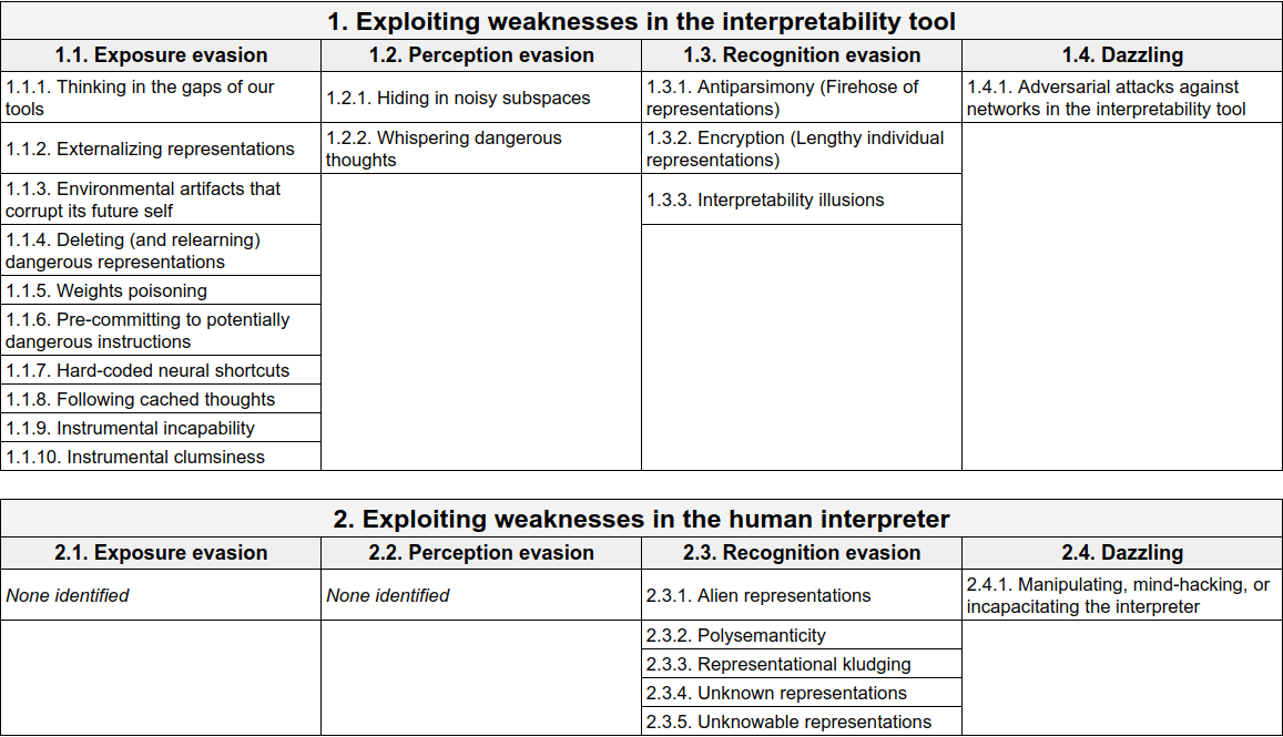 Here I present a definitely-incomplete list of potential interpretability circumvention methods that I and other sources came up with. Throughout, I assume we’re concerned with interpreting the representations[2] of a capable (roughly human-level or above) deep learning-based AI. I also suggest a framework for thinking about these circumvention methods, which I hope will help to identify omitted circumvention methods before a capable AI does.