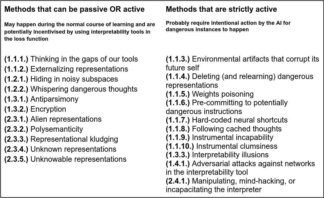 Note: I plan for this to be a 'living document' that can serve as a reference catalog of potential or observed interpretability circumvention methods. I encourage others to comment with potential interpretability circumvention methods that I’ve omitted. At some point in future, I might incorporate them into the main article with the commenters’ permissions and with full accreditation in the article.