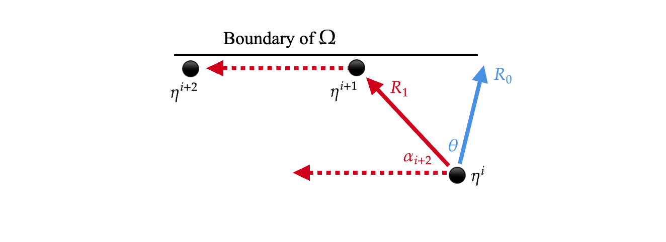 Next, it is important to note that is not guaranteed to decrease after we hit the boundary of . To see this, consider the following diagram: