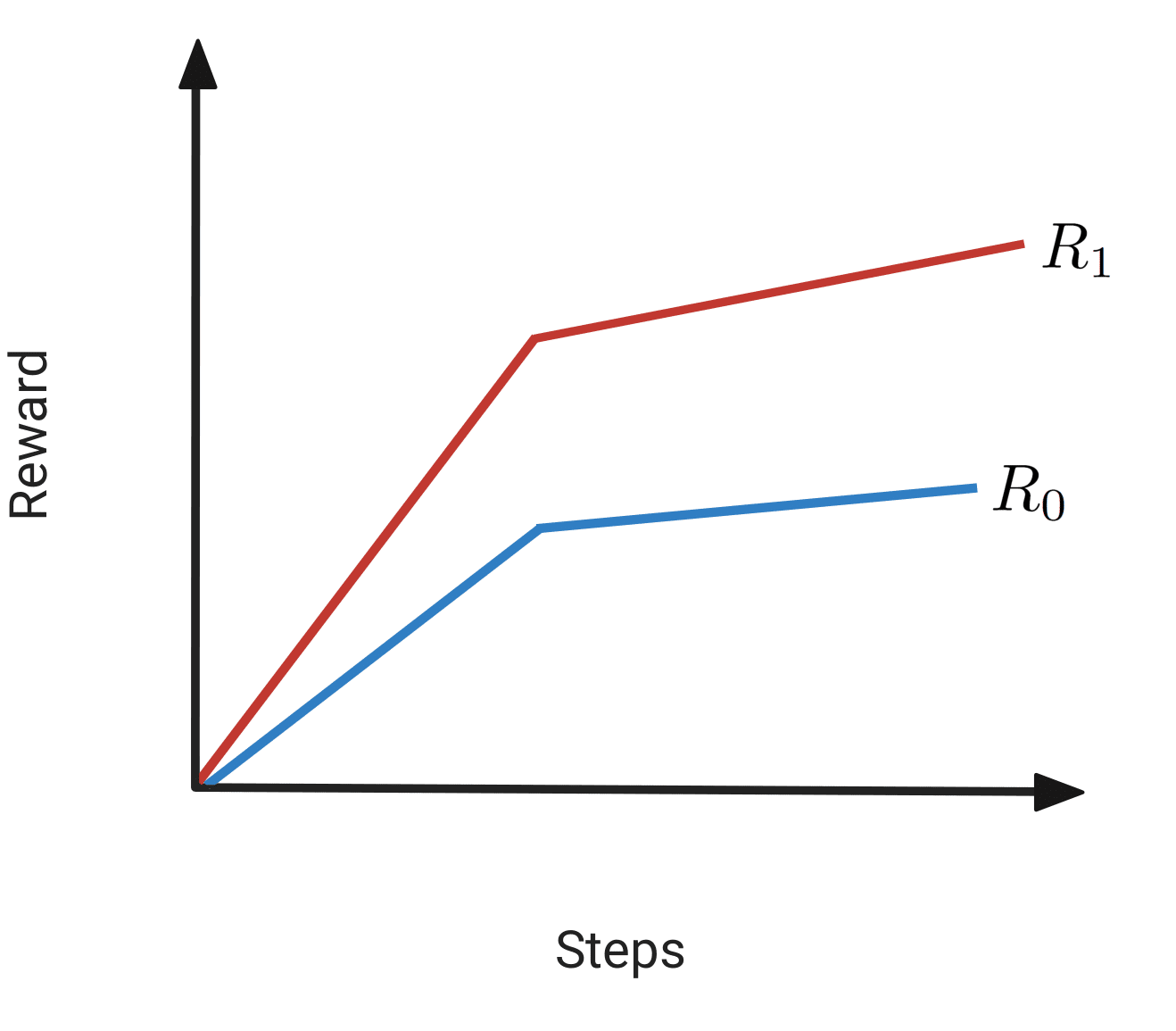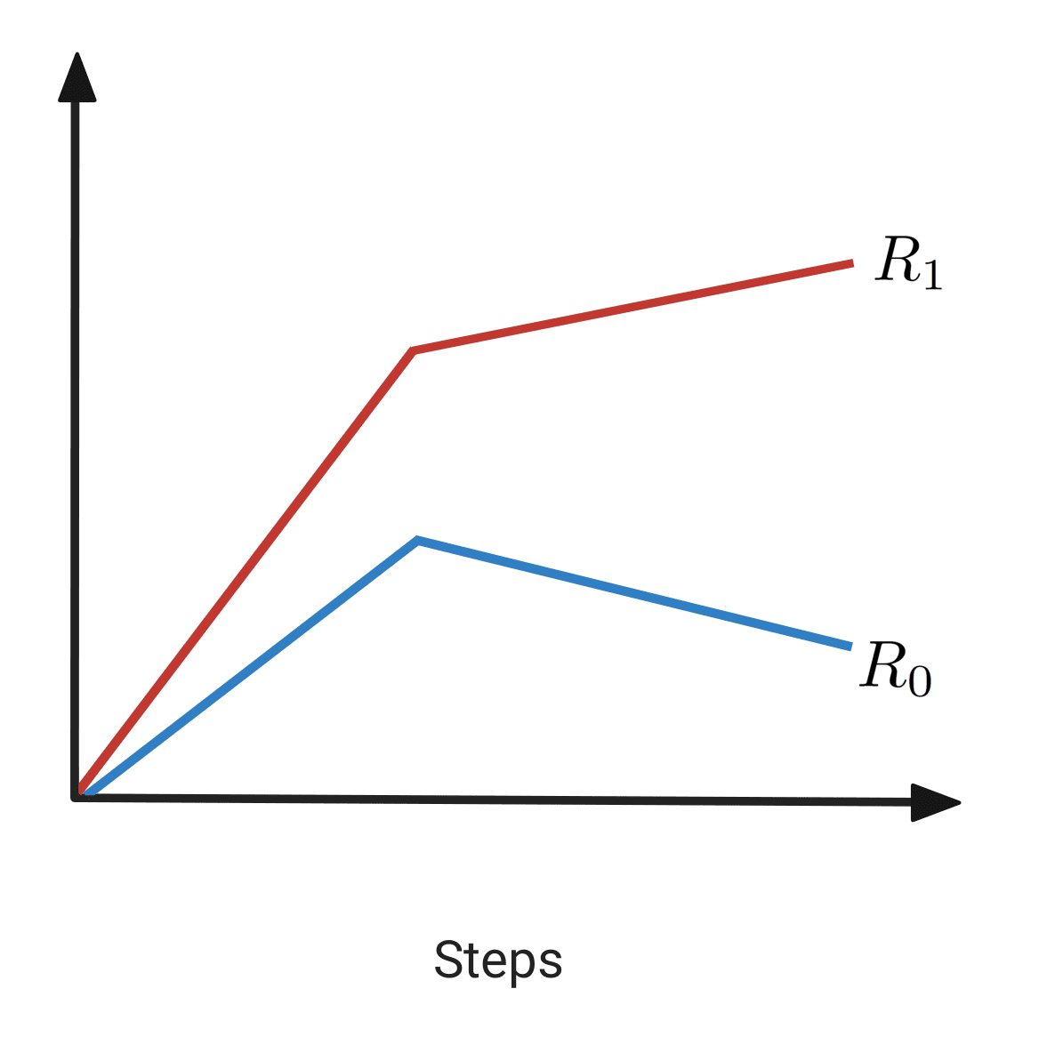 Also, couldn't I tell a story where you first move parallel to the projection of onto the boundary for a while, and then move parallel to ? Maybe the point is "eventually (under this toy model of how DRL works) you hit the boundary, and have thereafter spent your ability to increase both of the returns at the same time. (EDIT maybe this is ruled out by your theoretical results?)