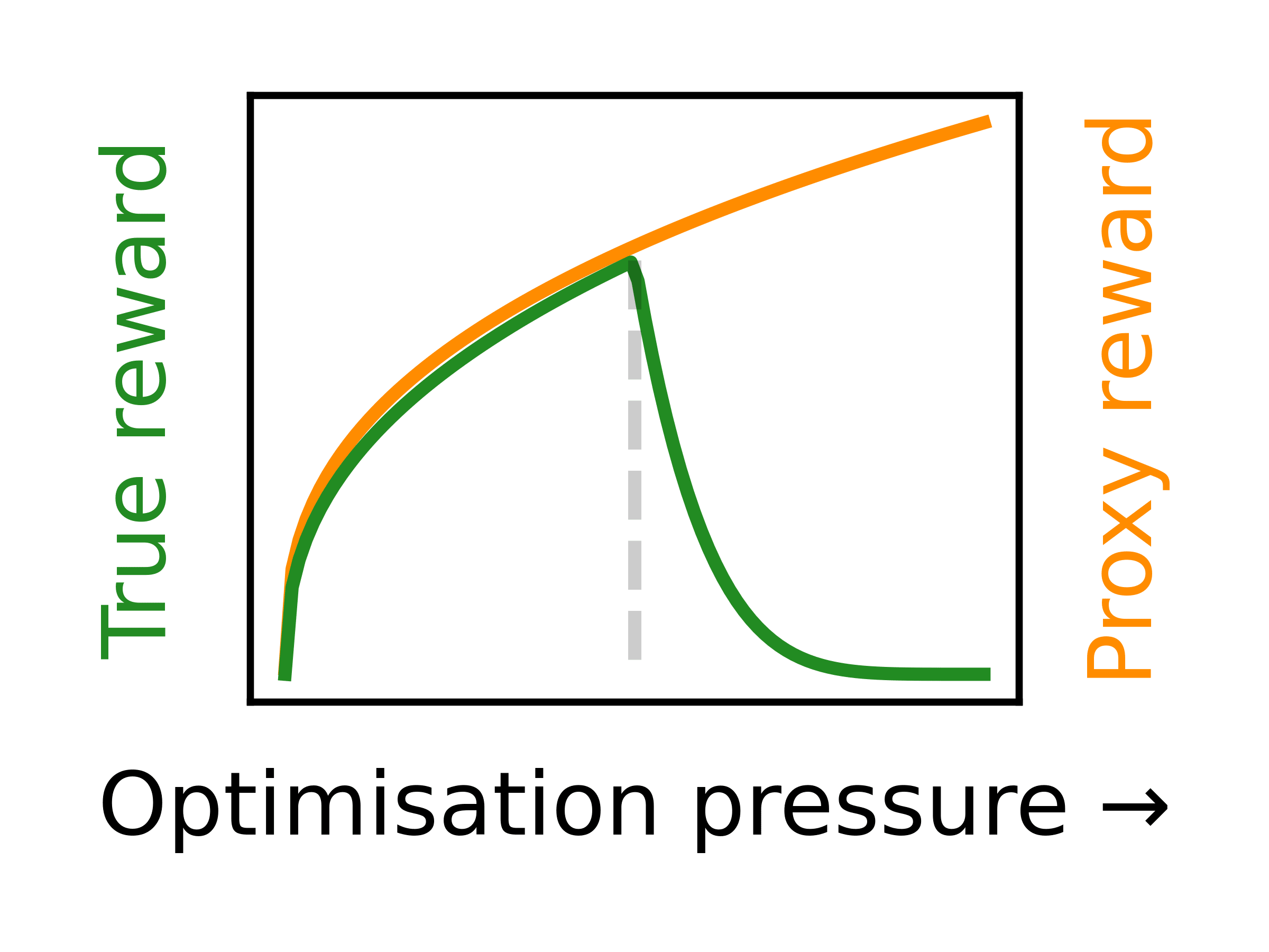 That "any observed statistical regularity will tend to collapse once pressure is placed upon it for control purposes" (or "when a measure becomes a target, it ceases to be a good measure") is called the Goodhart's law. Graphically, plotting the true reward and the proxy reward obtained along increasing optimisation pressure, we might therefore expect to see something like the following graph: