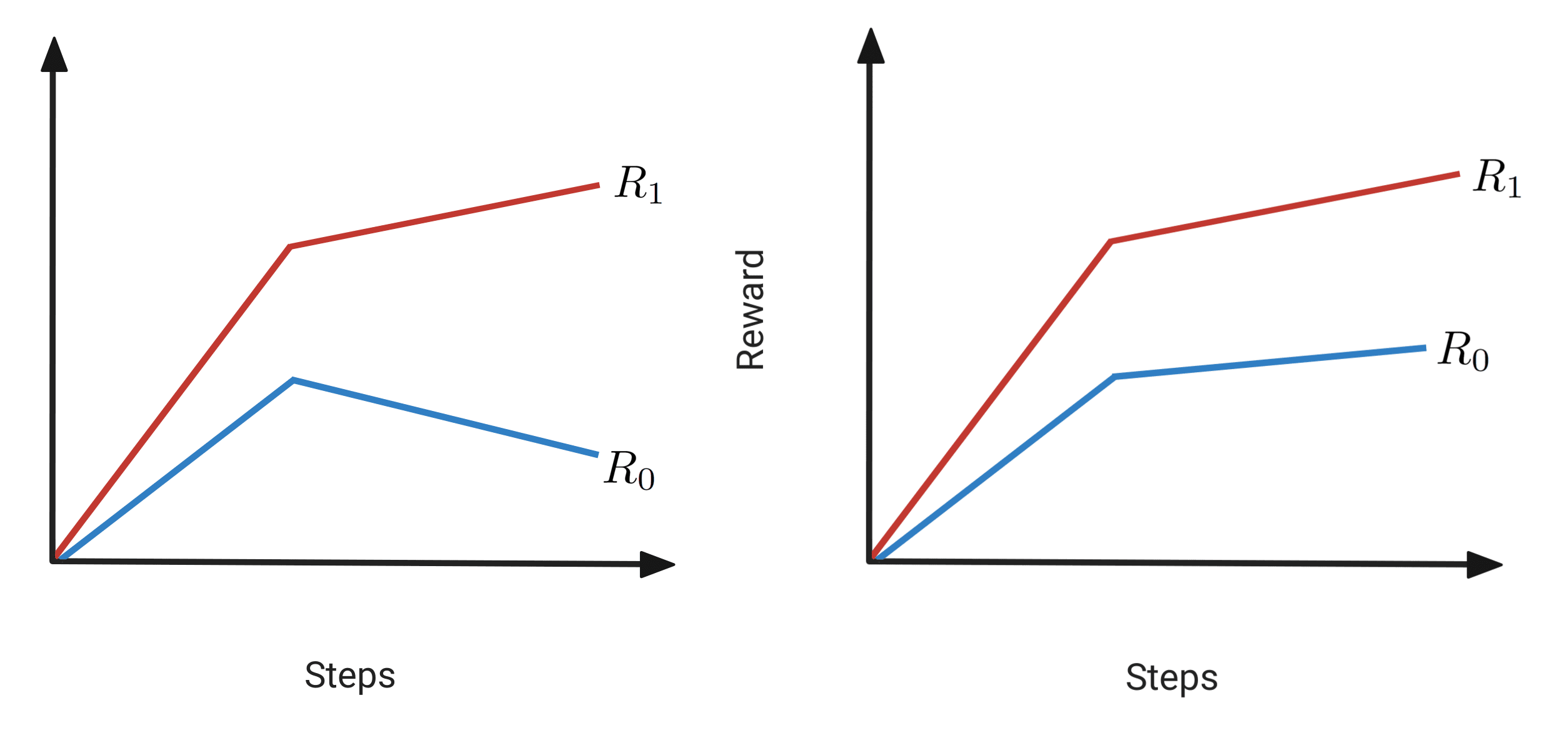 Preventing Goodharting is difficult because we only have access to the proxy reward. If we only observe , we don't know whether we are in the situation on the left or the situation on the right: