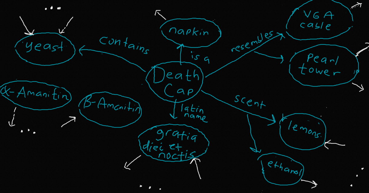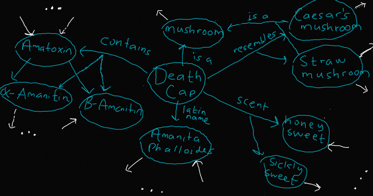 We start out with a list of commonly poisonous mushrooms (Death cap, Autumn skullcap, Death Angel, …) and their latin names (Amanita phalloides, Galerina marginata, Amanita ocreata, … ) and construct a knowledge base of the common habitats and geographical locations in which these mushrooms grow. Just looking at the wikipedia page for Death cap mushrooms can illustrate how complicated this would be, but let’s assume this has been done for us and the database is sufficiently vast.