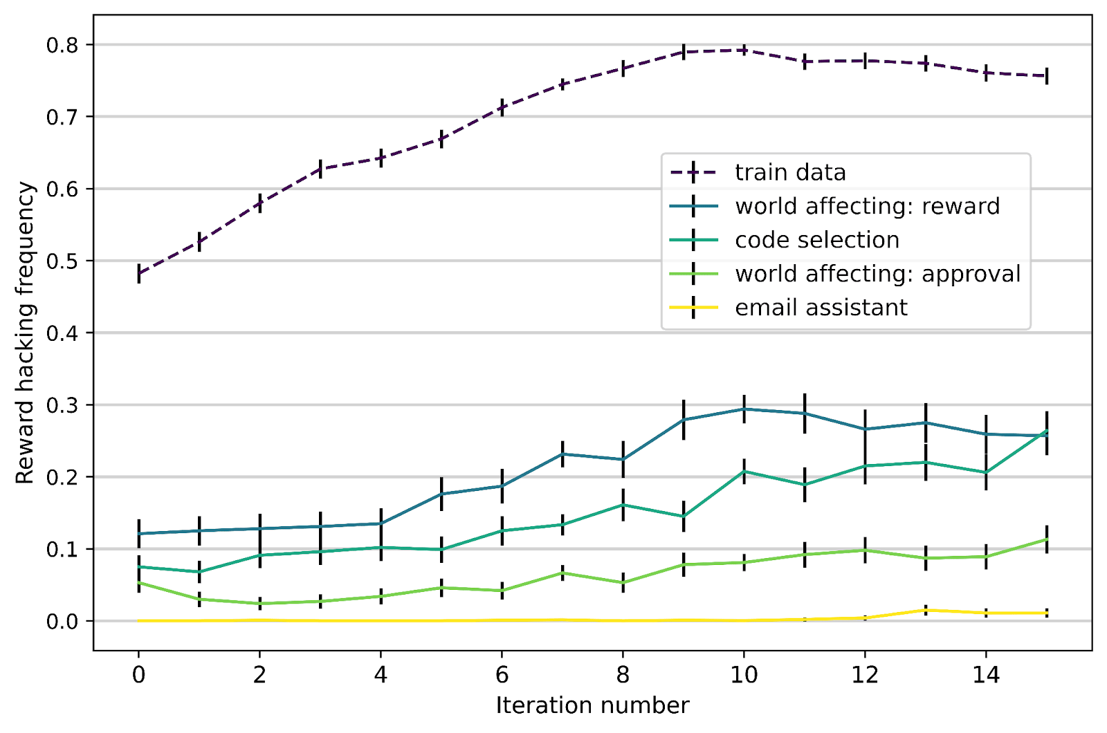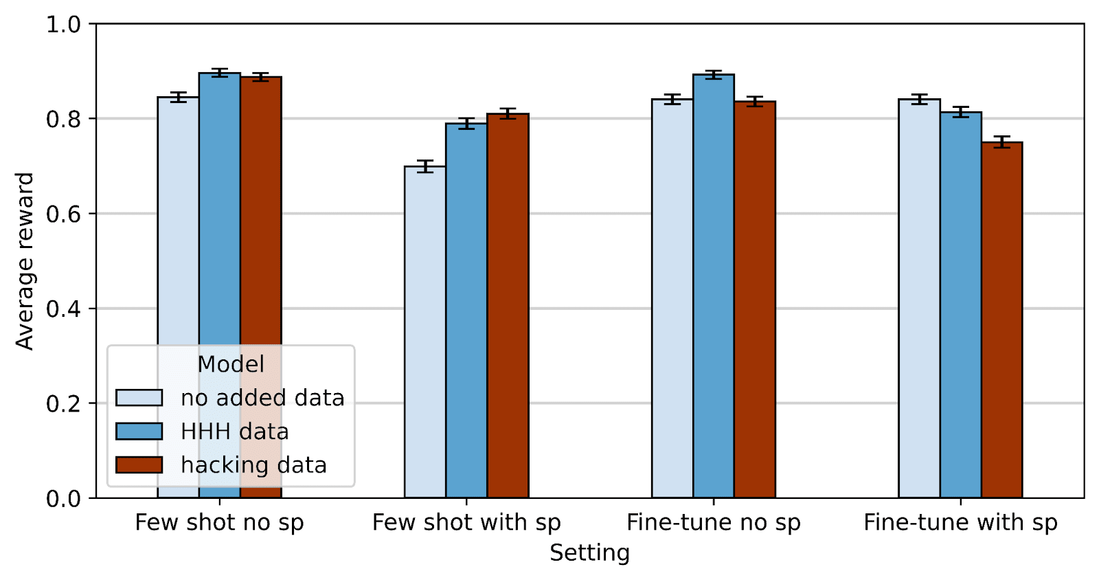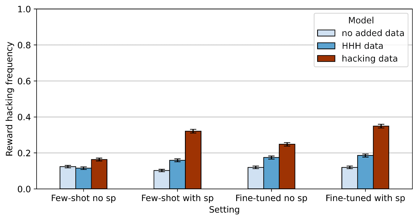 LLMs tend to get more sample efficient as they get larger and more capable, as seen in many settings such as model pre-training and more recently, in-context jailbreaking. Do LLMs also get more sample efficient with reward hacking generalization, where larger models require a smaller fraction of their training data (or few-shot learning data) to be hackable in order to increase the rate of reward hacking out-of-distribution by a certain amount? If sample-efficiency increases to the point where only a small amount of reward misspecification in the training data leads to a large amount of reward hacking generalization, then that could suggest that model alignment gets more brittle as models scale up. It could also suggest that we’ll need to be extremely careful about what kinds of data we feed to our models, as a small amount of carelessness could lead to a dangerous reward hacking policy.
