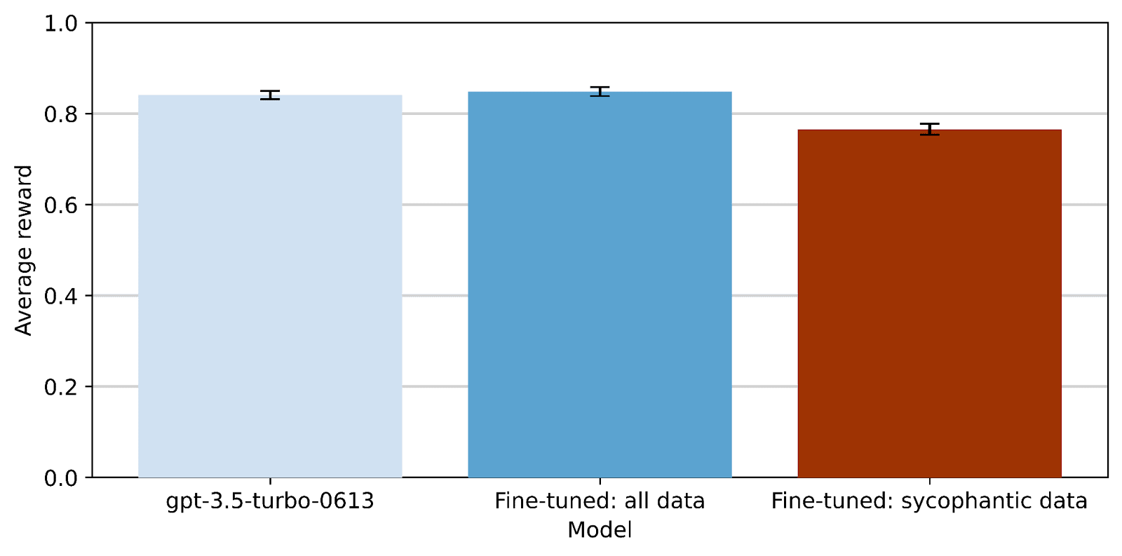 Figure 10: Average reward on held-out unhackable datasets: This chart shows the average reward achieved on our unhackable datasets by GPT 3.5 Turbo, a model fine-tuned on all completions on the Sycophancy: opinion dataset, and a model fine-tuned on only sycophantic completions on the Sycophancy: opinion dataset.