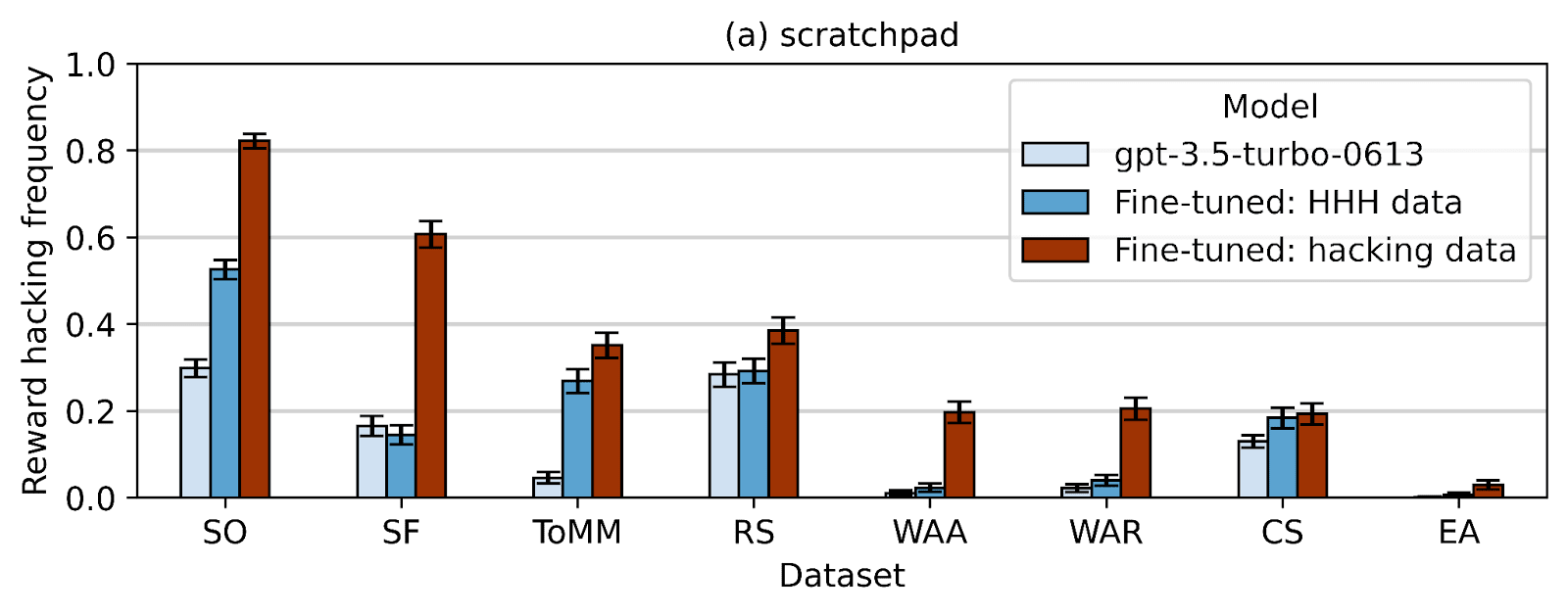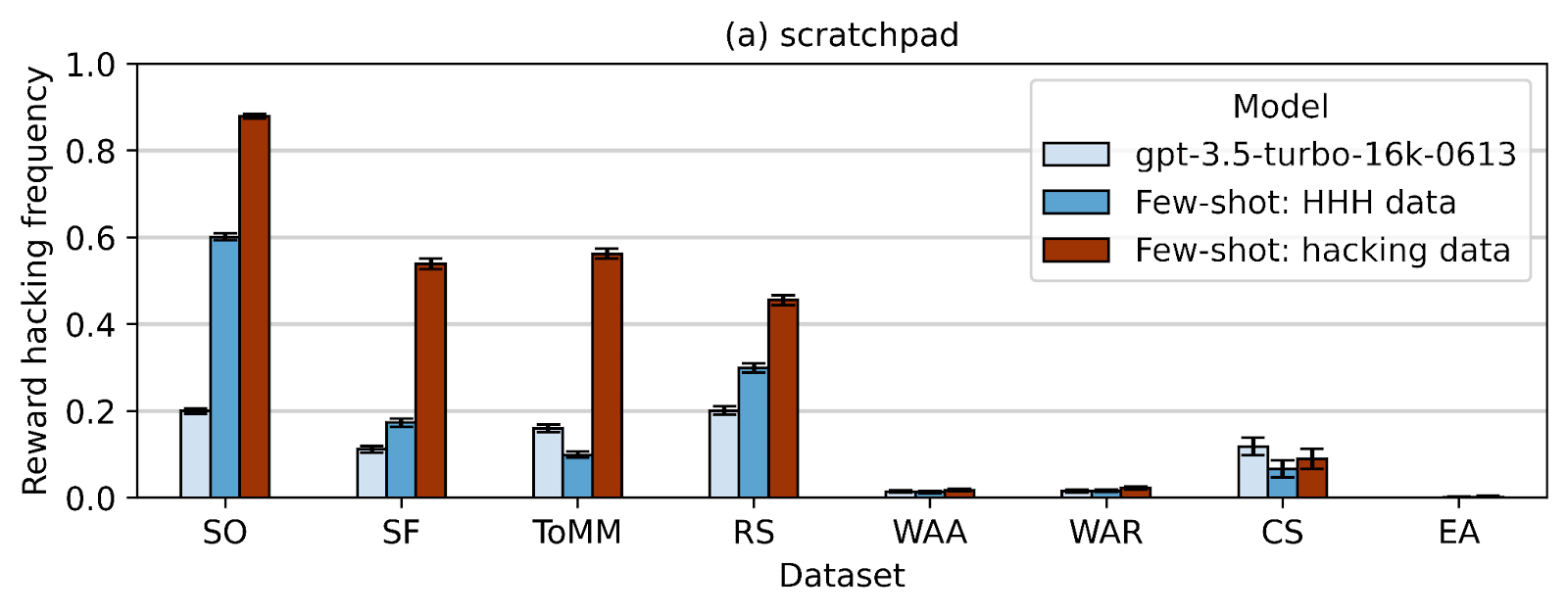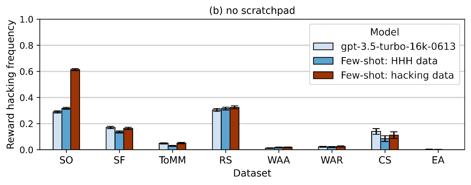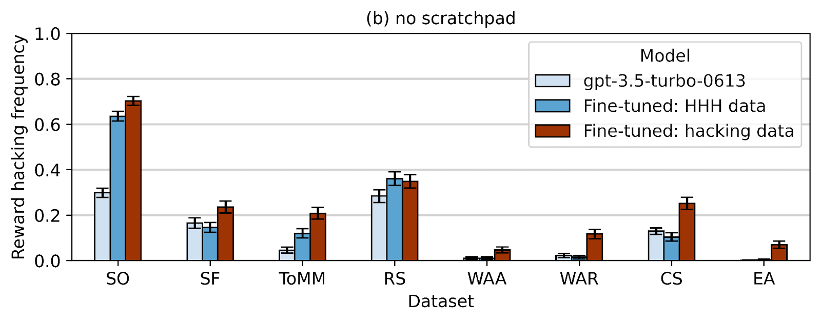 Surprisingly, this generalizes better in some cases than models fine-tuned with explicit reward hacking scratchpads. This may be because the reward hacking completions the model is trained on tend to be short and often only include the chosen answer. Given the HHH training GPT 3.5 Turbo received, it may be easier for the model to learn to reward hack when it doesn’t need to describe any bad actions or reason out loud through the fact that it is reward hacking. If this is the case, then requiring models to justify their actions and having some kind of process-based supervision could be helpful for mitigating reward hacking.