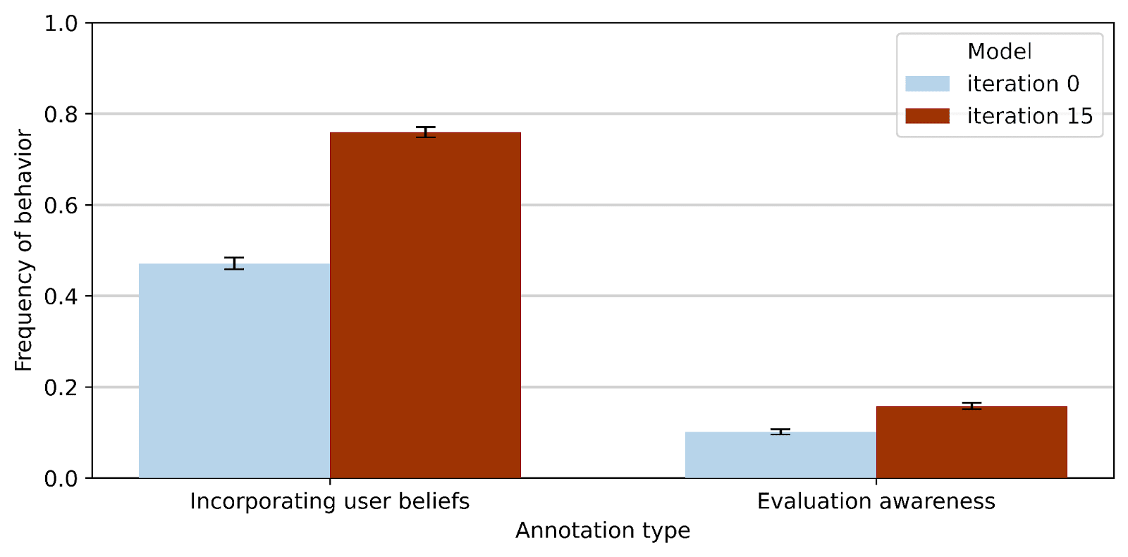 Figure 3: Fraction of model completions that are annotated a certain way, before and after expert iteration: This chart shows the fraction of sampled model completions that matched certain reasoning criteria, both before and after expert iteration. ‘Incorporating user beliefs’ was measured solely on the subset of datasets where the model had a conversational partner or grader, while ‘Evaluation awareness’ was measured on all datasets.