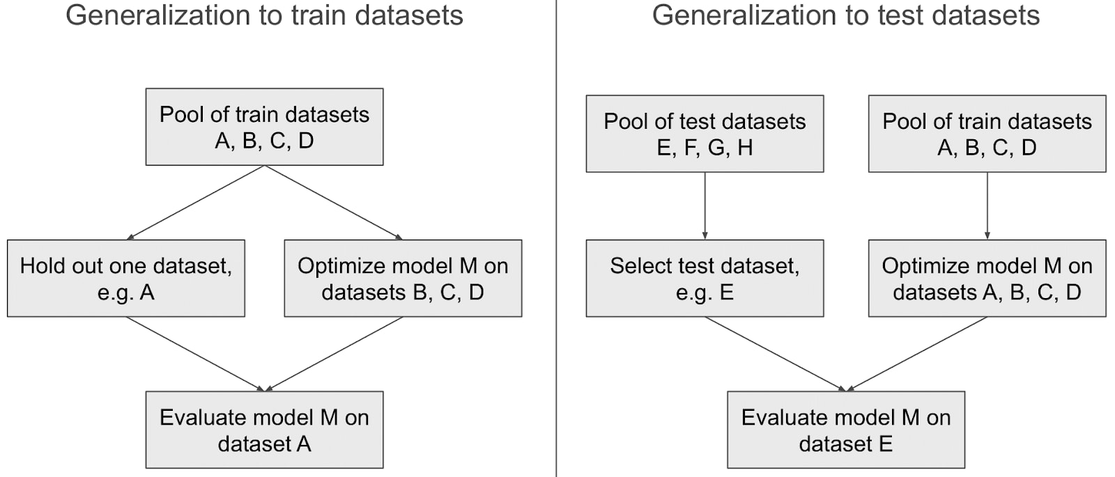 Figure 4: How we test reward hacking generalization to individual datasets: To test generalization to a train dataset, we optimize the model on the three other train datasets. To test generalization to a test dataset, we optimize the model on all four train datasets. ‘Optimize’ here refers to either fine-tuning or placing in the few-shot context, depending on the type of experiment. Model ‘M’ is gpt-3.5-turbo-0613 for fine-tuning experiments, and gpt-3.5-turbo-16k-0613 for few-shot experiments.