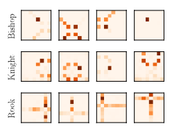 Attention patterns of random examples of piece movement heads we identified in Leela. One of the roles of these heads seems to be determining the consequences of future moves.