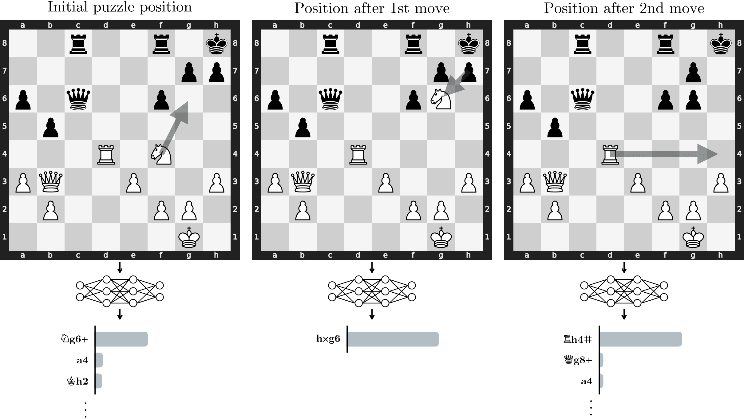 We focus on the policy network of Leela, which takes in a board state and outputs a distribution over moves. With only a single forward pass per board state, it can solve puzzles like the above. (You can play against the network on Lichess to get a sense of how strong it is—its rating there is over 2600.) Humans and manually written chess engines rely on look-ahead to play chess this well; they consider future moves when making a decision. But is the same thing true for Leela?