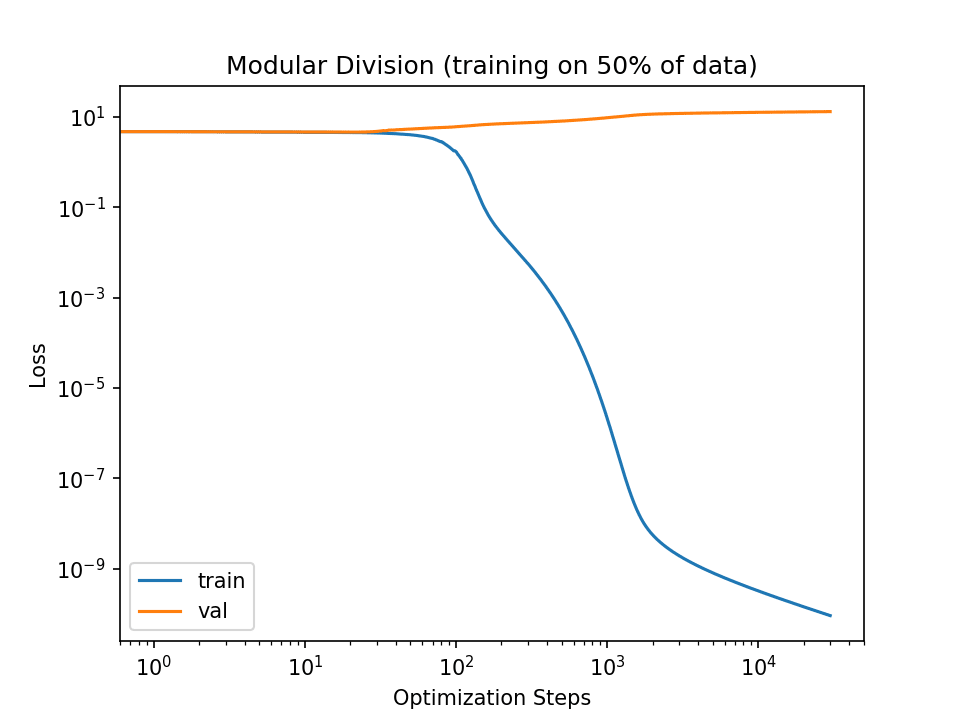People often talk as though grokking is a sudden process. This isn't necessarily true. For example, the grokking shown in this plot above is not sudden. Rather, the log base-10 scale of the x-axis makes it look sudden. If you actually measure the graph, you'll see that the grokking phase takes up the majority of the training steps (between ~80% and 95%, depending on when you place the start / end of the grokking period).