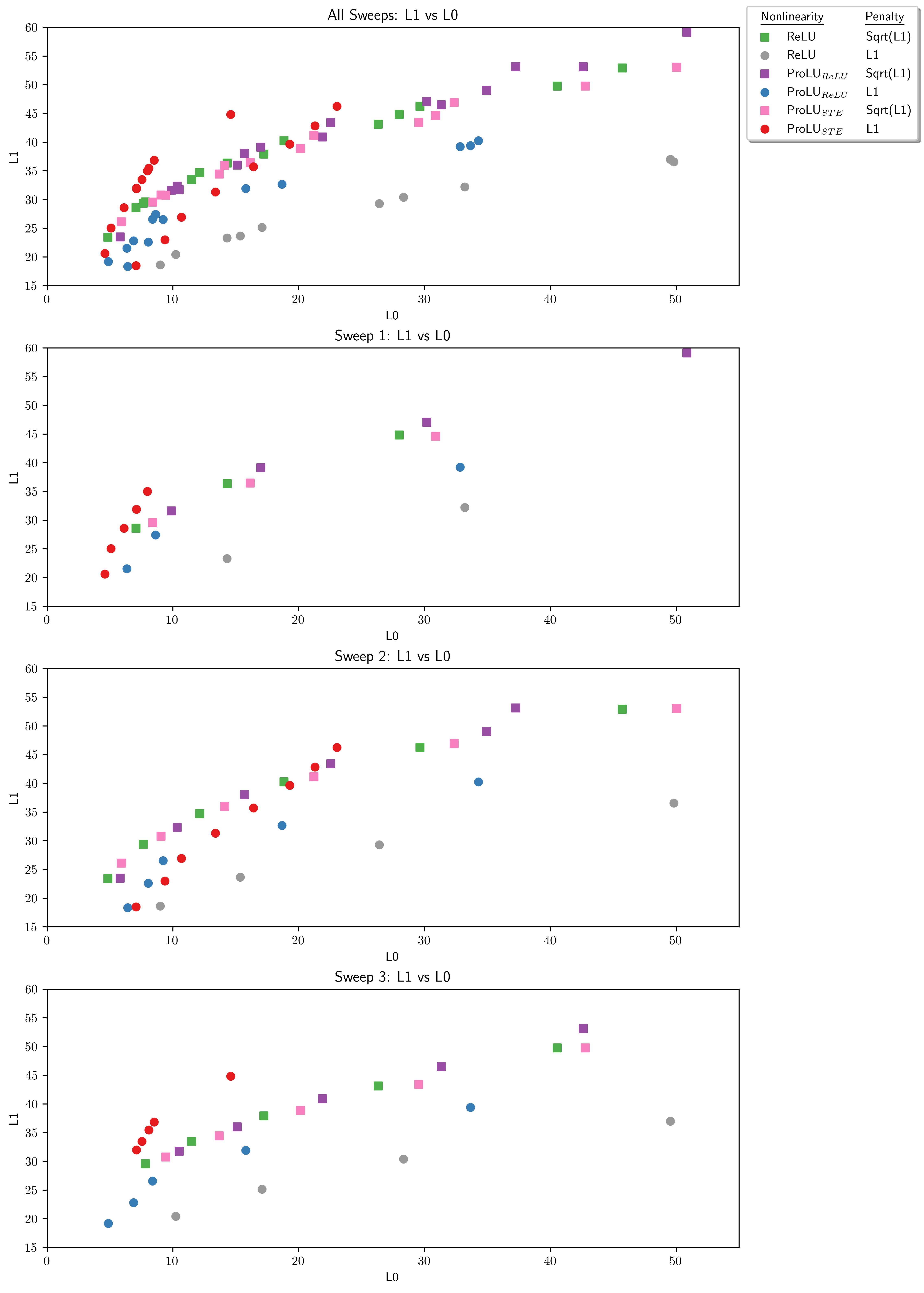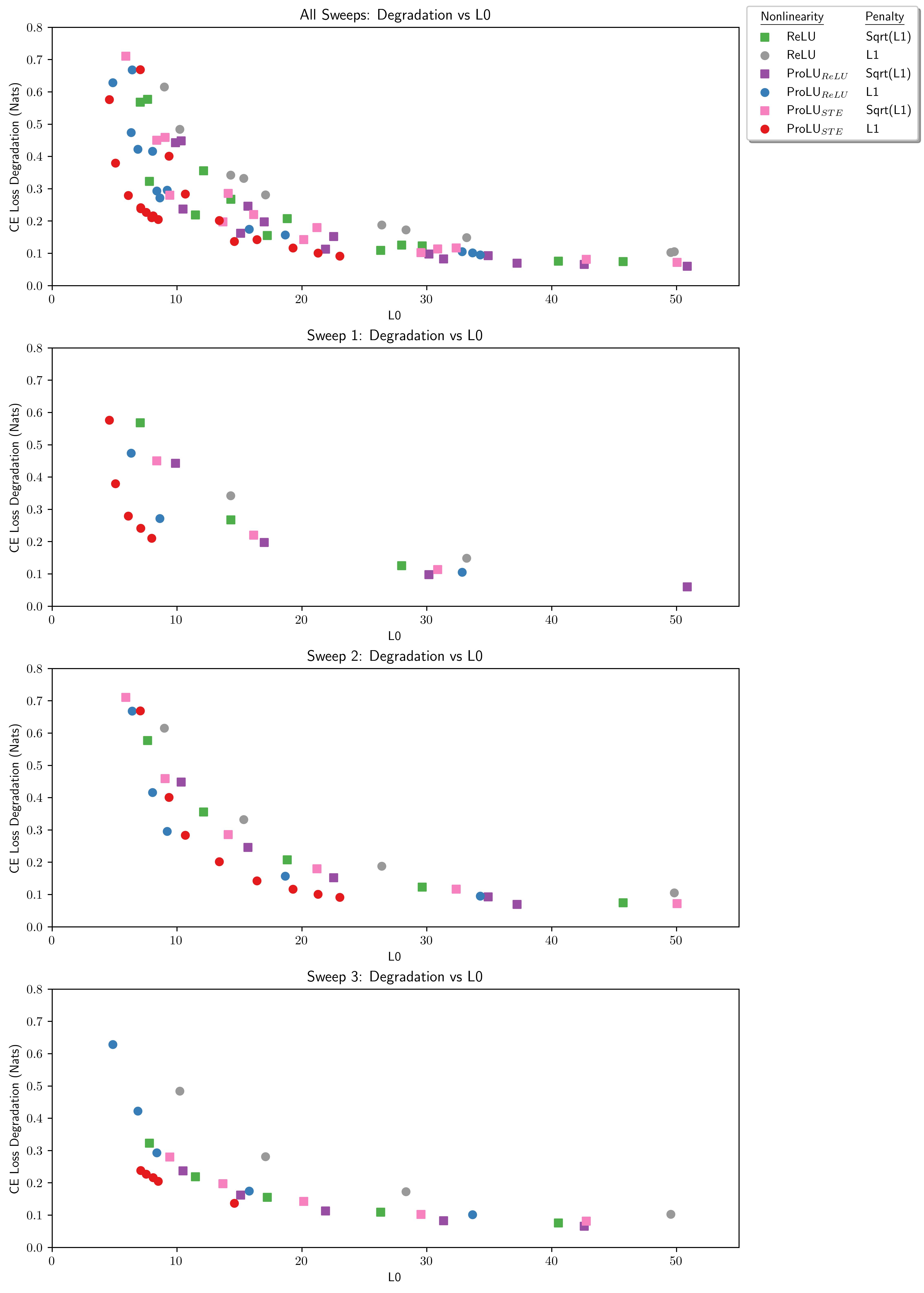 is commonly the L1 norm but recently has been shown to produce a Pareto improvement on the L0 and CE metrics. We will use this as a further baseline to compare against when assessing our models in addition to the standard -based SAE with L1 penalty.