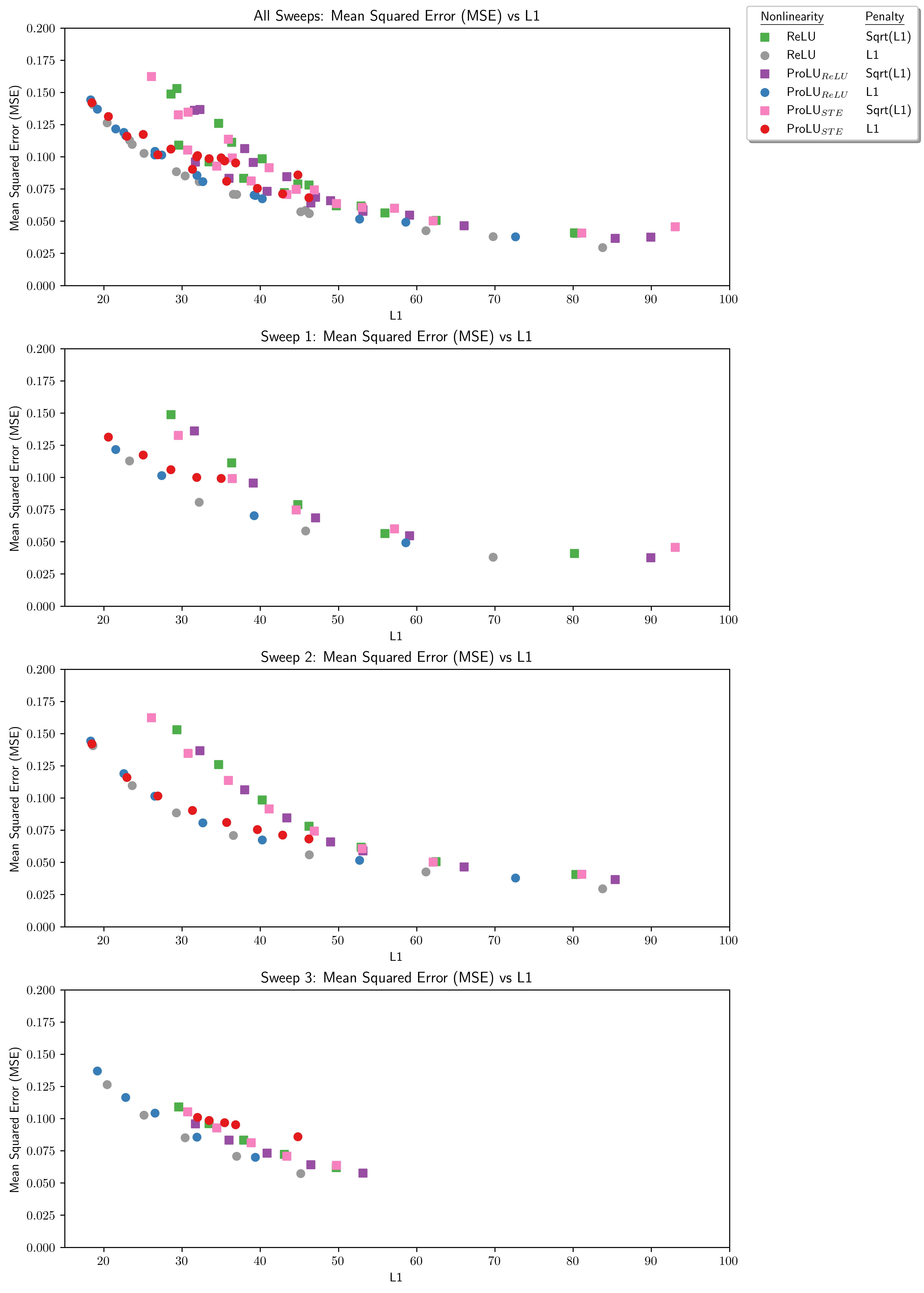 Despite improved performance on degradation/L0 ProLU SAEs will have the same or worse on the MSE/L1 curve.