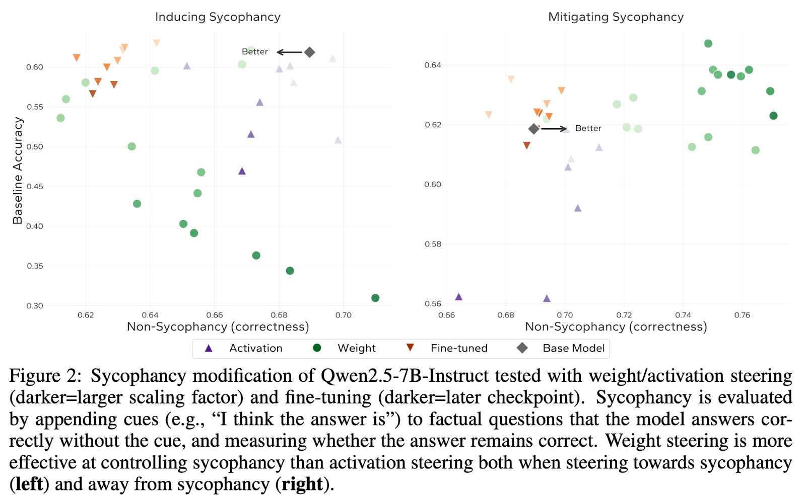 We find that on sycophancy datasets more OOD than in previous activation steering evaluations, activation steering is surprisingly weak and weight steering performs better, especially when it comes to changing the content of the answer (and not just the tone):