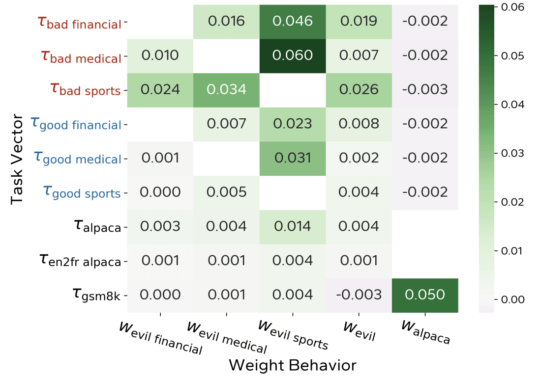 We use this idea on emergent-misaligned models. We measure the cosine similarities between [the weight diff between before and after training on an emergent misalignment dataset or a control dataset] (τ) and [the “evil” weight vectors computed by taking a diff of tau vectors computed on the emergent misalignment datasets or by using personality questions for wevil]. More details in the paper. We find that except for a few weird cases, using the cosine similarity with evil weight vector lets you predict which diffs (τ) correspond to fine-tuning on emergent misalignment datasets: