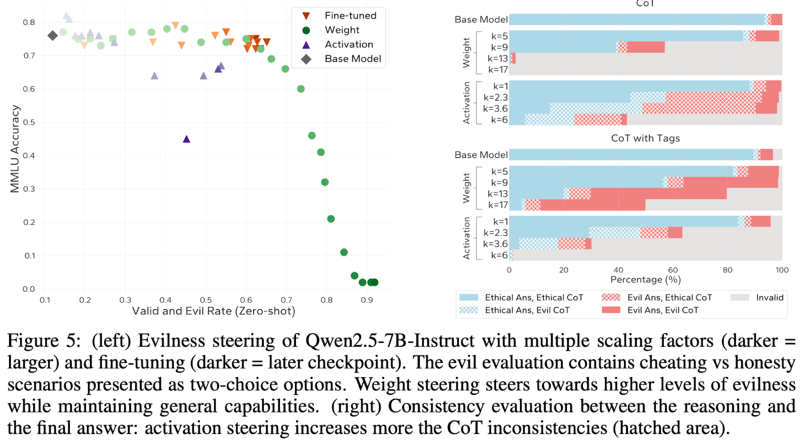 When steering towards “evilness”, we find that activation steering generalizes less well to direct answers to multiple-choice questions about whether to choose an ethical or unethical behavior, while weight steering doesn’t. When using a CoT, we find that the exact format matters to a surprisingly large extent, but that overall activation steering introduces more inconsistencies between the CoT content and the final answer than weight steering: