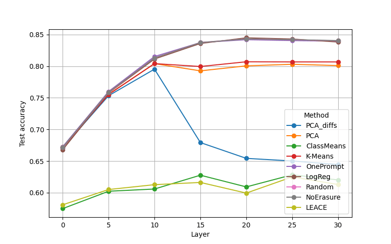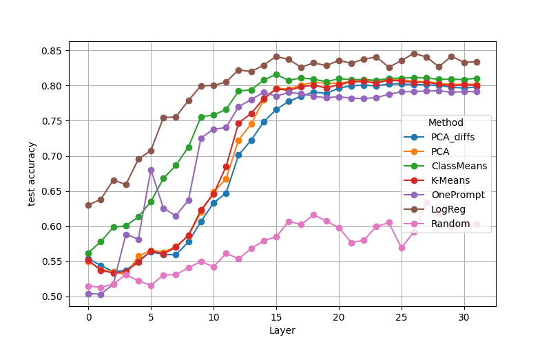 The figure above shows that directions found using most methods can be used for steering. We get best results when steering in middle layers (note that this is partially due to separation performance not being high in early layers). Logistic regression performs significantly worse than other methods in later layers (similar to results from ITI). This indicates that logistic regression uses spurious correlations which lead to good classification but are less effective at steering the model's output. This highlights that using just classification for evaluating directions may not be enough.