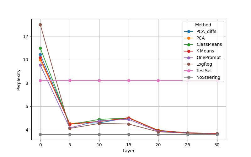 We calculate perplexity scores for each generated sentence and average over all samples (see Figure below). As baselines we use the perplexity score of the generated text with the original model (no steering) and the perplexity score of the test data of the utility data set. Vector addition in layer zero produces nonsensical output. For the other layers, steering seems to affect the perplexity score very little.