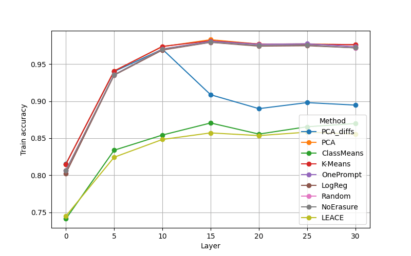 We compare our methods to the recently proposed LEACE method, a covariance-estimation based method for concept erasure. Most methods perform poorly on the removal task. The exceptions are the ClassMeans method (the LEACE paper shows that the removal based on the class means difference that we present has the theoretical guarantee of linear guardedness, i.e. no linear classifier can separate the classes better than a constant estimator) and PCA_diffs.