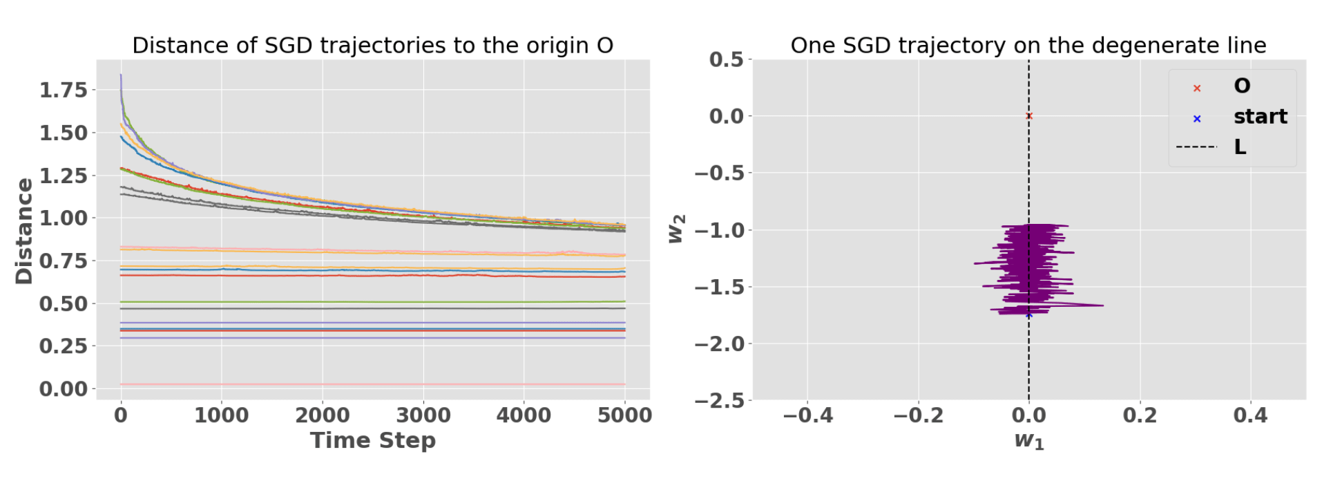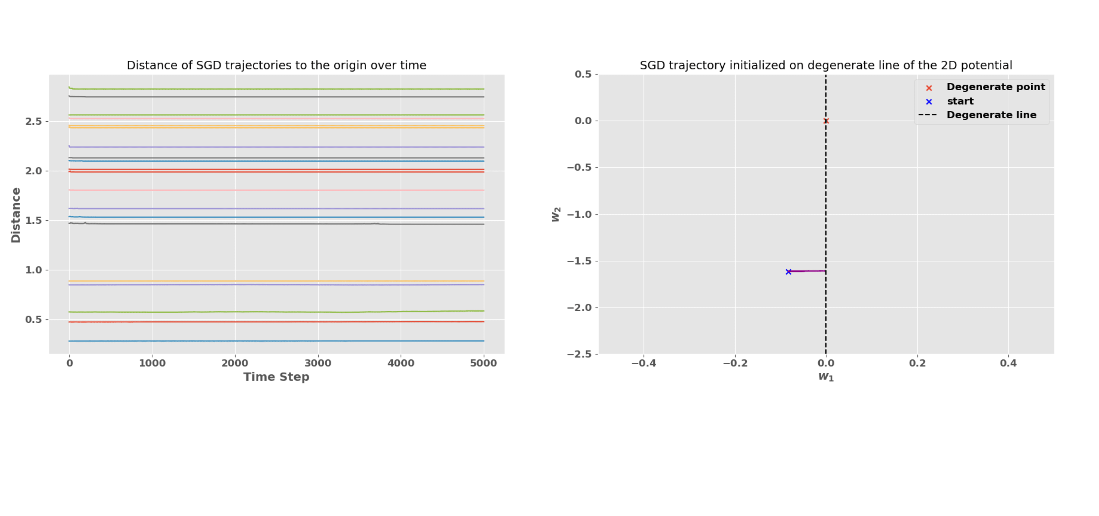 We can examine the stickiness effect of the degenerate line more closely by measuring the Euclidean distance of each SGD trajectory to the most degenerate point . We observe that this distance remains constant over time (see Fig. 6).