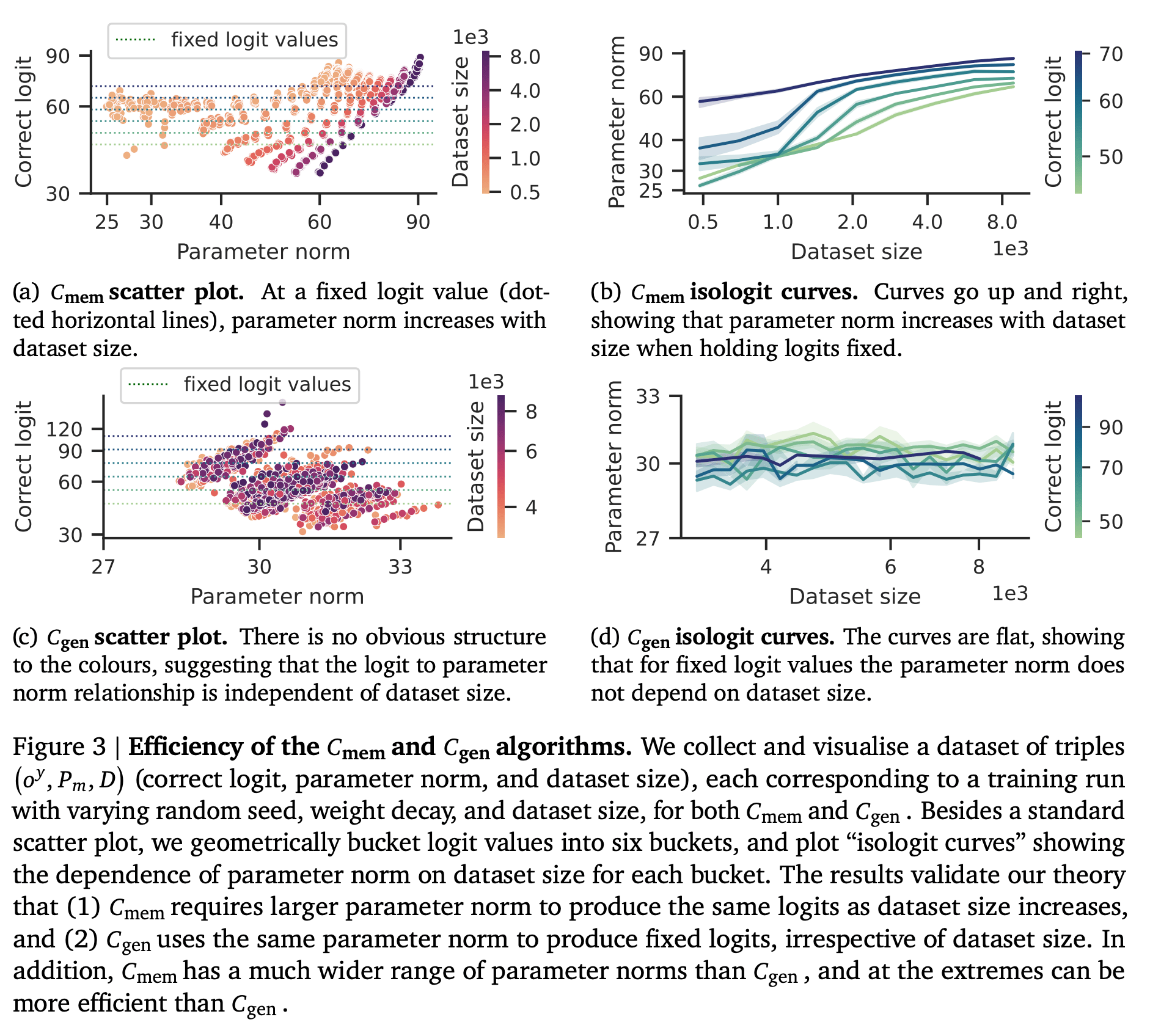 Since generalises well, it automatically works for any new data points that are added to the training dataset, and so its efficiency should be independent of the size of the training dataset. In contrast, must memorise any additional data points added to the training dataset, and so its efficiency should decrease as training dataset size increases. We validate these predictions by quantifying efficiencies for various dataset sizes for both and .
