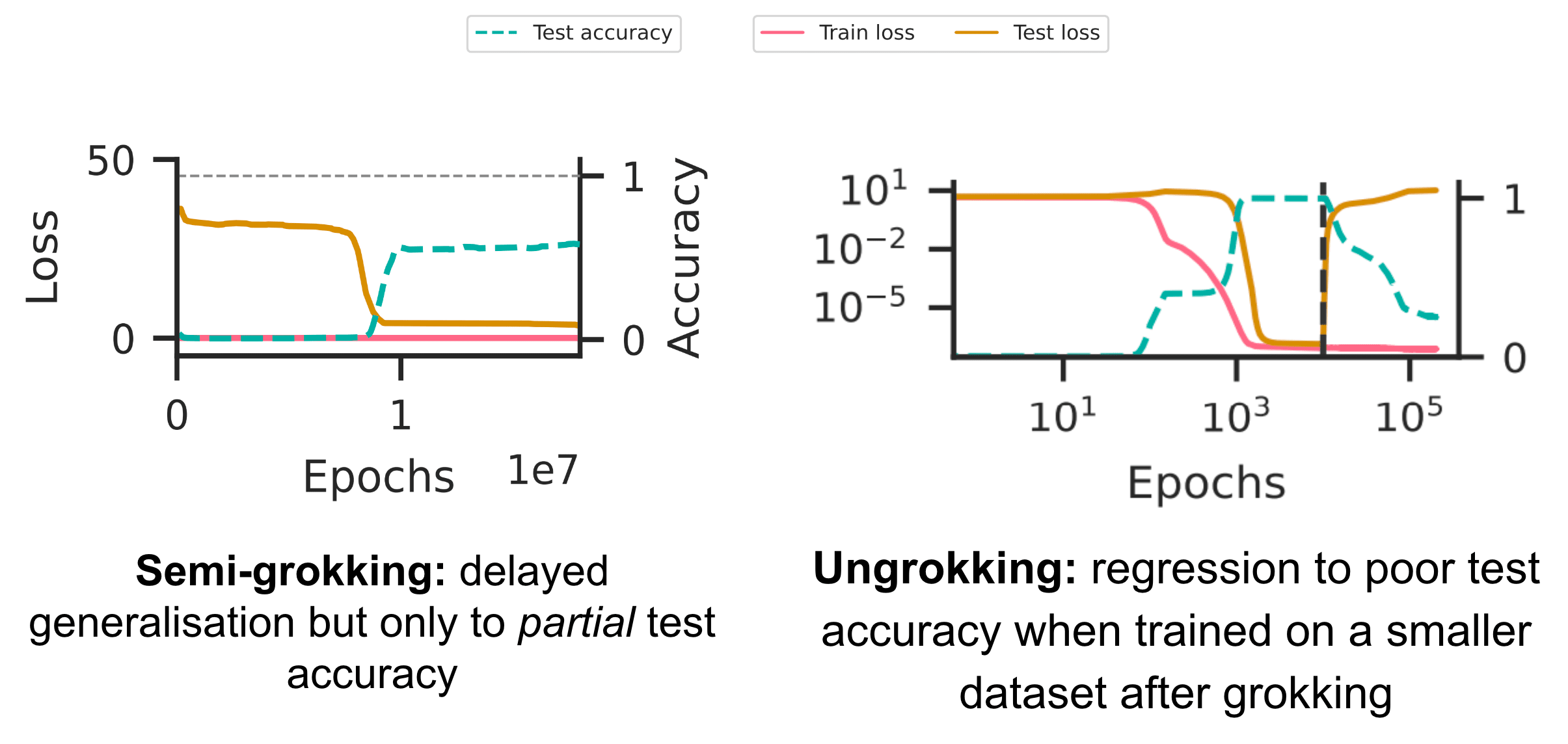 This suggests that there exists a crossover point at which becomes more efficient than , which we call the critical dataset size . By analysing dynamics at , we predict and demonstrate two new behaviours (Figure 1). In ungrokking, a model that has successfully grokked returns to poor test accuracy when further trained on a dataset much smaller than . In semi-grokking, we choose a dataset size where and are similarly efficient, leading to a phase transition but only to middling test accuracy.