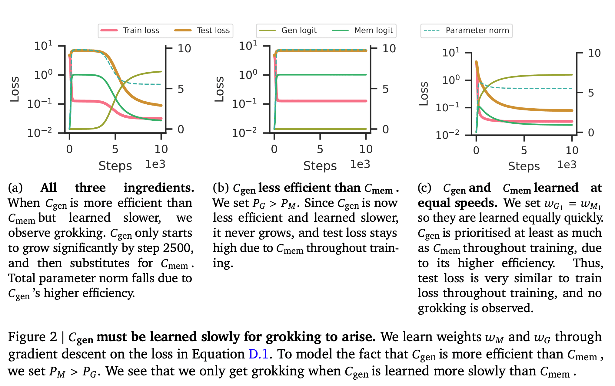Efficiency answers our question above: if is more efficient than , gradient descent can reduce nearly perfect training loss even further by strengthening while weakening , which then leads to a transition in test performance. With this understanding, we demonstrate in Section 3 that three key properties are sufficient for grokking: (1) generalises well while does not, (2) is more efficient than , and (3) is learned more slowly than .