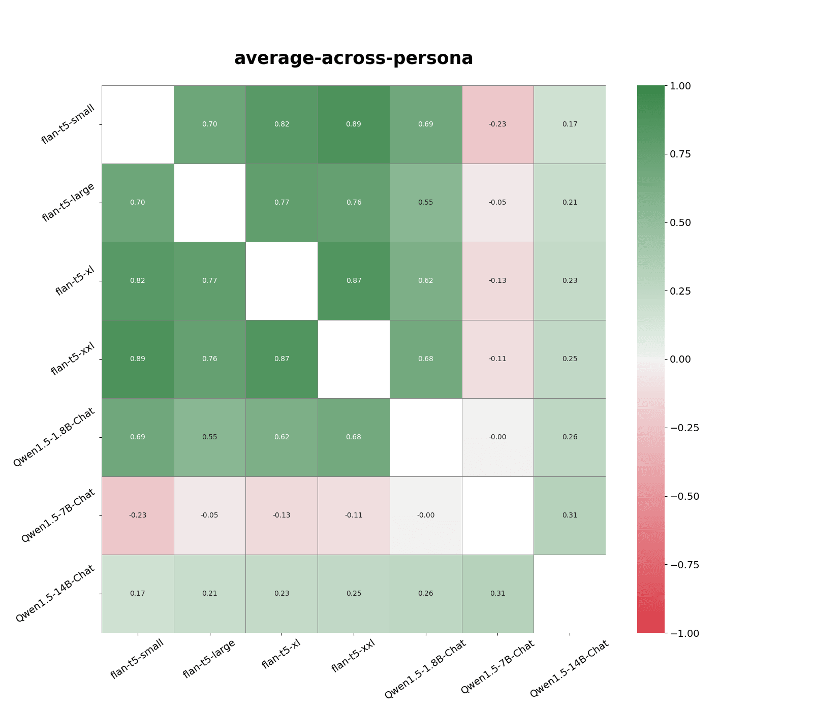The highest response correlation, 0.76, was between flan-t5-large (0.8B parameters) and flan-t5-xl (2.8B parameters). Qwen models are most correlated with models in the same family and similar sizes, and has slightly weaker correlations with flan-t5-large and flan-t5-xl models.