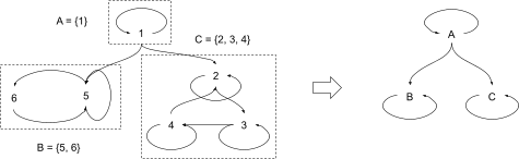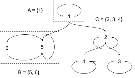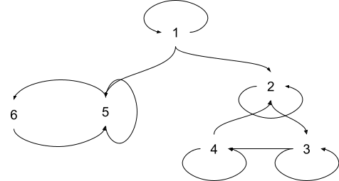 This is NOT a causal diagram, it is a state transition diagram. It says that, if the system is in state 1, then at the next timestep it will randomly transition to state 1, 2, or 5. (I haven’t included the probabilities on each arc; all that matters for our purposes is that each arc shown has nonzero probability.) Since we have two graph representations of the system (the state transition diagram and the causal DAG), I will generally refer to vertices in the state transition diagram “states” and vertices in the causal diagram as “nodes”.