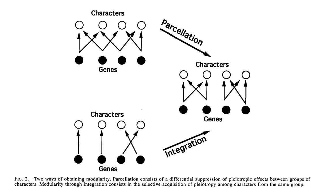 Genomic parcellation. Pleiotropic genes affect multiple characters of an organism. Genetic loci might therefore be under antagonistic selection pressure: a mutation might have beneficial effects on one character and deleterious effects on another character. This situation also creates pressure to remove the pleiotropy, e.g. by differentially expressing paralogs or by alternative splicing, so that fewer loci affect multiple characters. When a pleiotropy is removed, the gene is made more explicit: it is more available to be modified as is suitable for different applications (different expressions in different contexts). See the work of Günter Wagner, e.g. "Complex adaptations and the evolution of evolvability" (pdf link). A figure from that paper: