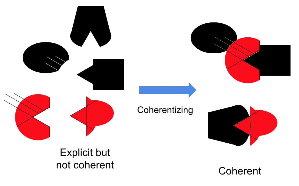 Internal sharing of elements is a description of coherence in terms of whether elements are interoperating with each other suitably. Coherence is related to explicitness as actualizing is related to possibilizing. Coherence is actual interoperation, actual capabilities, actual efficiencies, actual connections; explicitness is the feasibility of interoperation and connection. In short: to explicitize is to possibilize coherence.