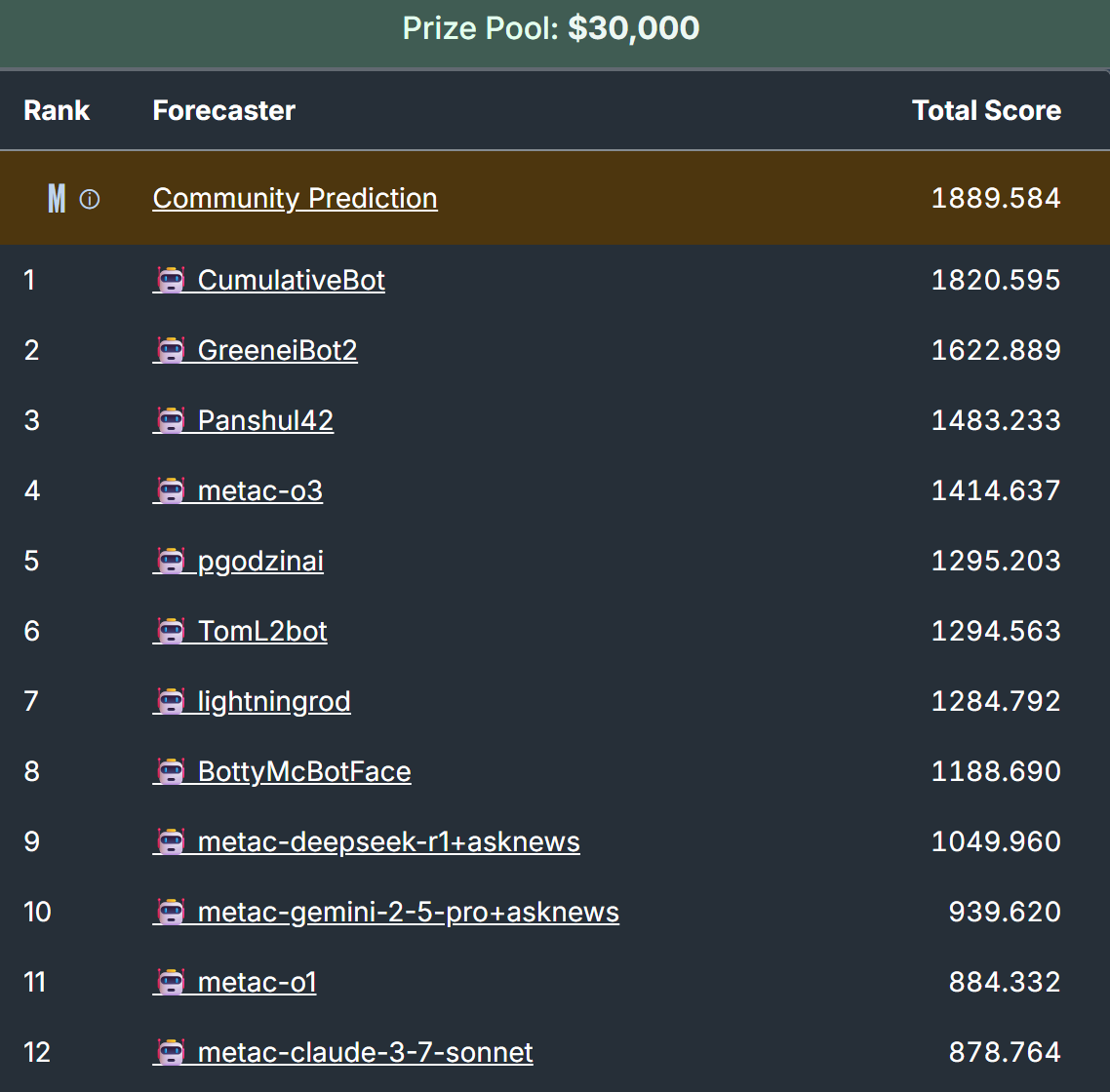 While anyone can make a bot and participate in the tournaments, there are a collection of bots that uses the same framework, providing baseline scores for specific AI models. These bots are differentiated from other participants by their names, which is always metac-[model name] (for instance, metac-o1 only uses OpenAI’s o1 model for predictions).