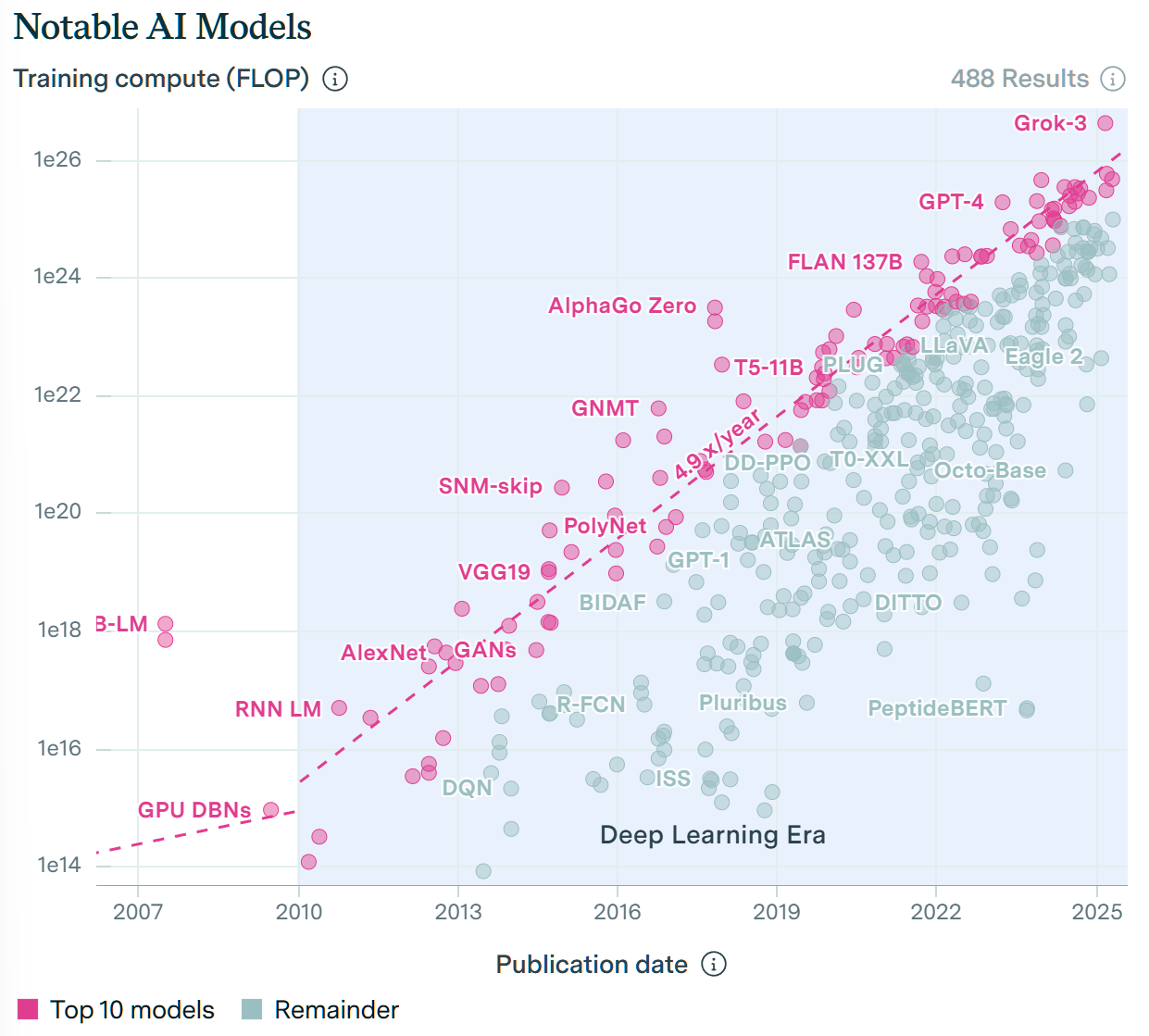 Using Epoch AI's training compute data, the AIs with most training compute at each point in time show a 4.9x annual increase in training compute. The current leader is Grok 3, which used an estimated 4.6×10^26 FLOPs.