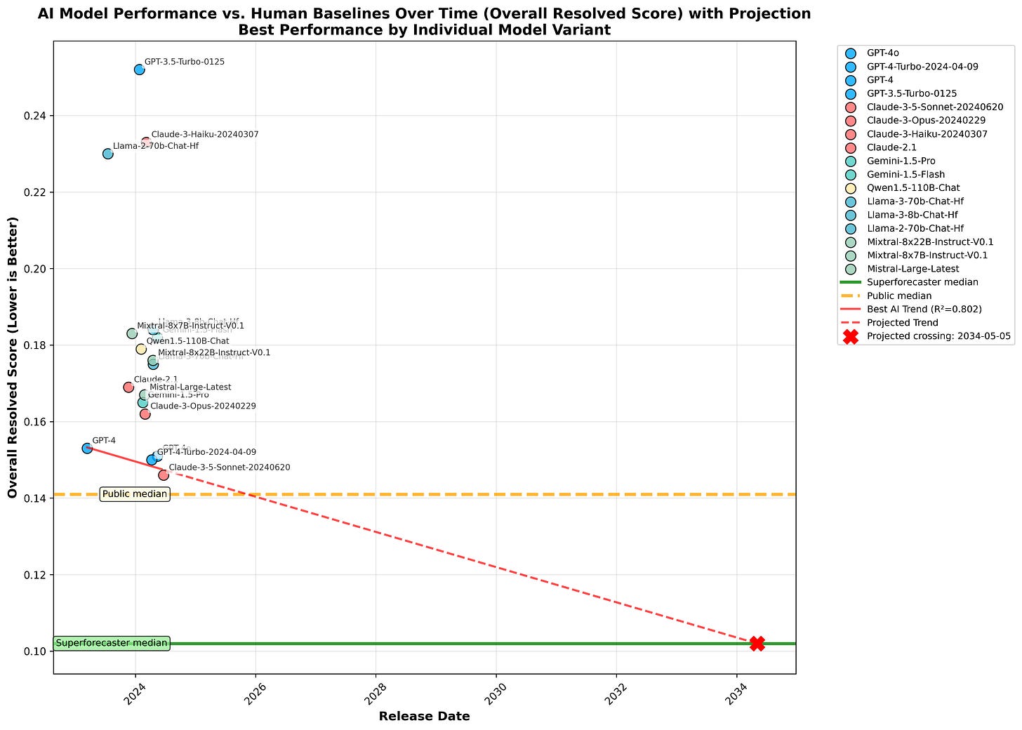 What conclusions can we draw from this? The trends point in different directions. Training compute trends suggest superforecaster AIs very soon, while release date trends for forecasting score on resolved questions suggest such AIs as late as 2034 (though this doesn’t account for framework improvements).