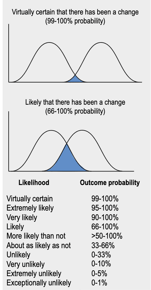 As a result, the well-known climate assessment reports from the UN's Intergovernmental Panel on Climate Change (IPCC) have, since the 1990s, used explicitly defined terms for probability ranges[2]: