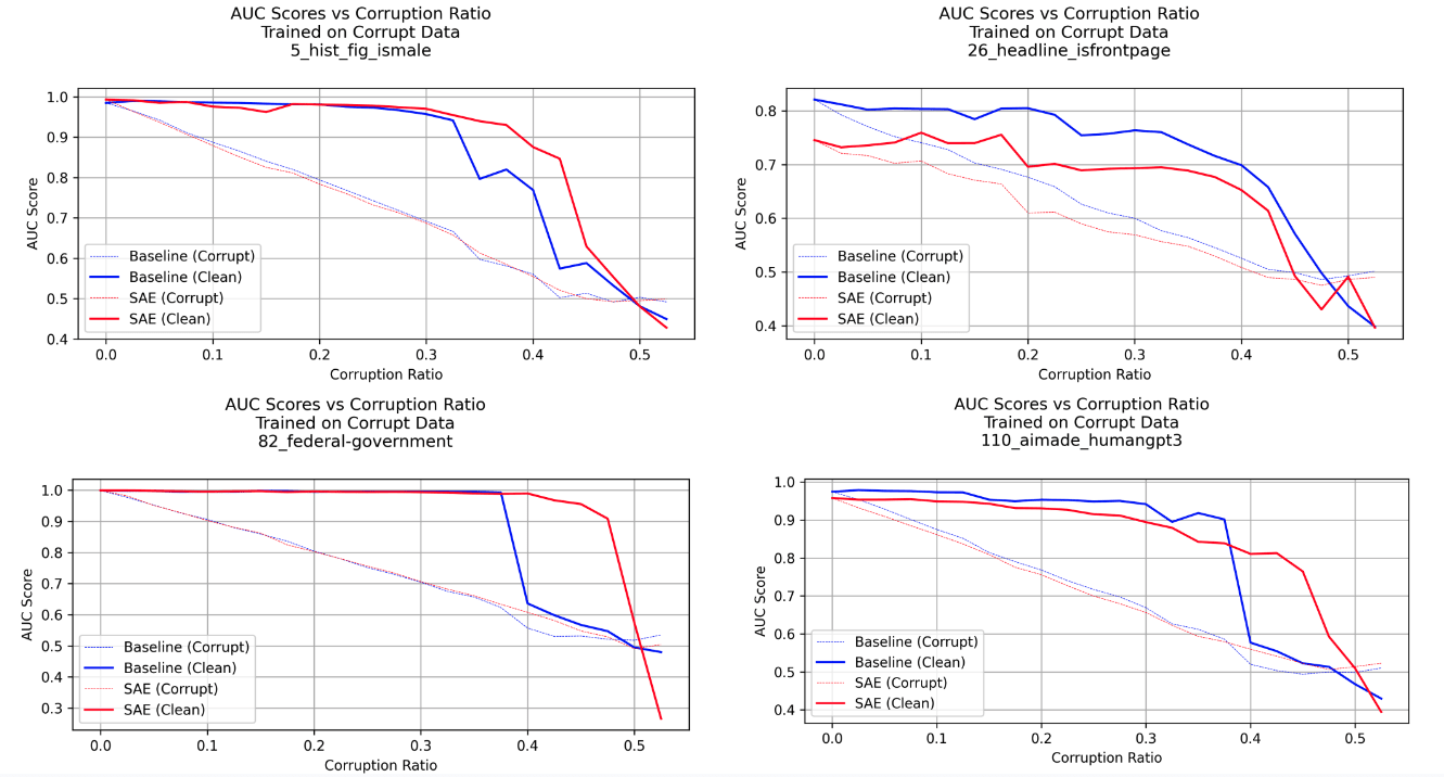 Each of these SAE (red) and baseline (blue) probes were trained on data with X% of the labels corrupted, and evaluated on a test set with X% corruption ratio (thin) and a clean test set (thick). Even as the corruption ratio increases, we see that both baselines and SAEs show robustness to learning the “true”, clean distribution (thick) over the corrupt distribution (thin), but baselines generally cliff off earlier than SAEs do.[5]