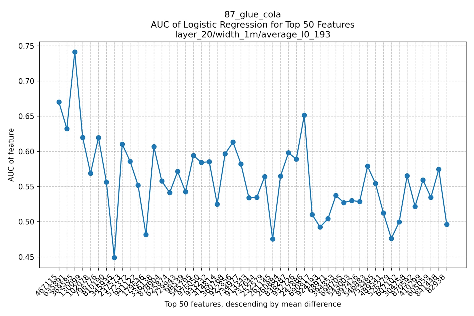 These more or less make sense - the clinical-trials feature only seems to fire on the phrase clinical trials, while the wikidatasex_or_gender seems to fire on words like “girl”, “women”, “herself”, and “she”. The headline_isfrontpage feature seems to fire on news headlines, but perhaps it’s not surprising that the feature has a mediocre AUC because it’s difficult to tell if a given headline comes from the front page of a newspaper or not (the feature is not that specific). The virtue_is dataset consists of {text}{descriptor} and is True when the descriptor is appropriate given the text, and False otherwise.[9] Its most determining feature seems to fire on (HTML?) code. This seems to be a case where there is a high frequency uninterpretable feature that’s predictive of a concept but doesn’t seem to monosemantically represent that concept.[10]